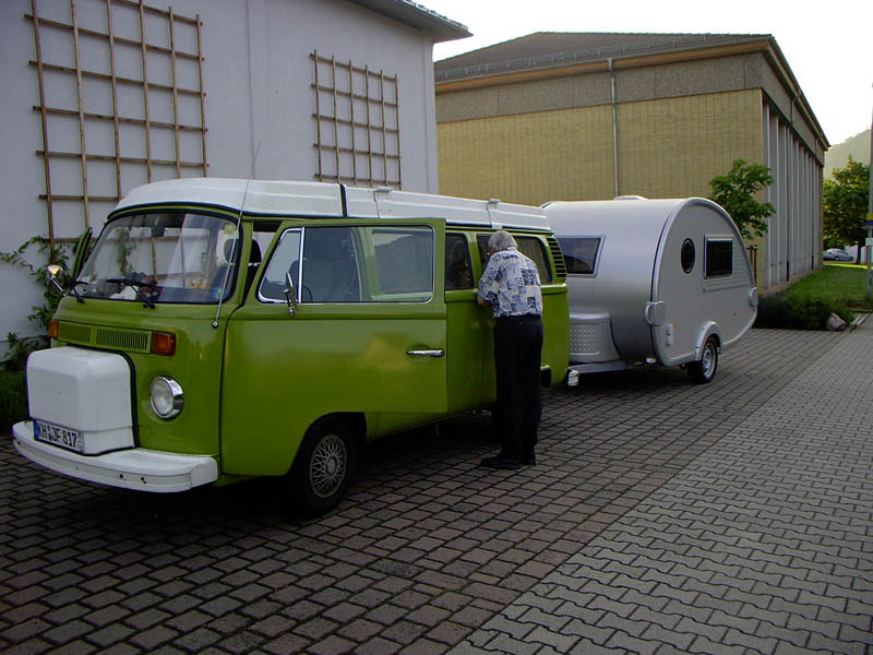 Unser Klaufix, ein 77er Westfalia Essen, am Haken des T2b von Kumpel Christian nach Abholung, da der Berlin noch keine AHK hat.