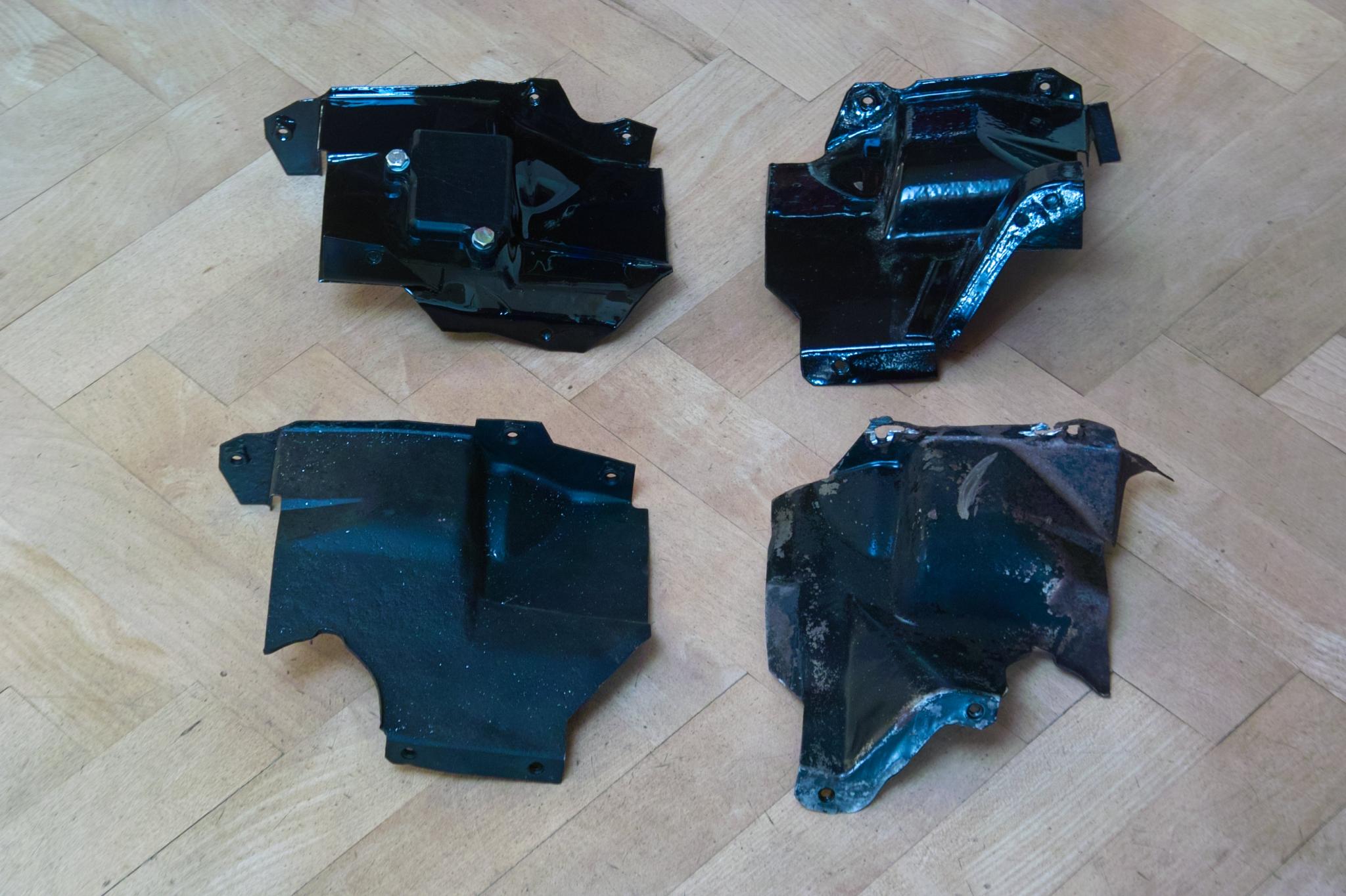 Ich habe mal Bilder von den verschiedenen Versionen der Bleche gemacht. Jeweils oben die europäischen Bleche und unten die US-Version. Die oberen Laschen schließen an die obere Verblechung an und sind weitestgehend identisch. Die unteren Laschen unterscheiden sich deutlich, weshalb die Bleche mit dem Wechsel der Abgasanlage ebenfalls getauscht werden müssen. Durch die halbkreisförmigen Aussparungen der US-Bleche verlaufen Teile der US-Abgasanlage, die im Gegensatz zu Europäischen erstmal nach vorne läuft und dann erst in die Wärmetauscher nach hinten.