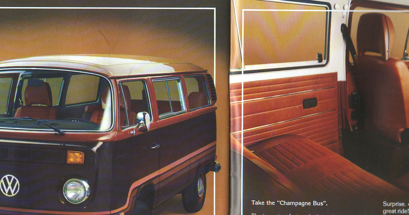 ein paar von euch suchen nach beigefarbenem Cordstoff für die Sitze im CE II, vielleicht mögt ihr die Farbe, dann ist natürlich alles gut. Was allerdings den Originalfarbton angeht: ich bin zu 100% sicher, dass der Cordbezug, so wie man ihn heute in vermutlich nahezu allen unrestaurierten Champagnes findet, von der UV-Strahlung verblichen ist und im Original eine relativ dunkle rot-braun Färbung hatte. Dafür spricht zum einen der Verkaufsprospekt, den VW ziemlich weichgezeichnet hat: (darf ich meinen Scan hier posten?)