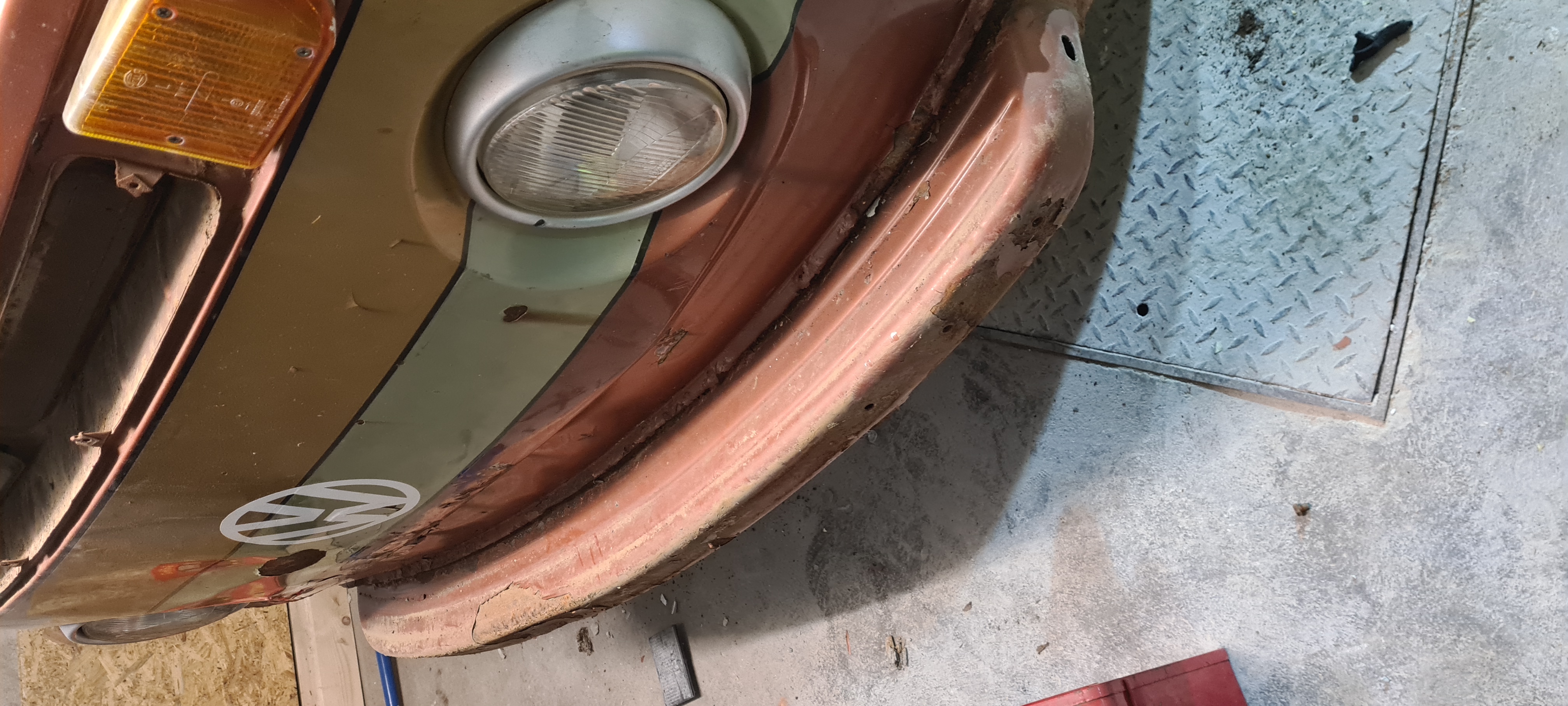 Ist echt teilweise sehr merkwürdig. Schweißstellen tauchen echt wenig auf, zumindest an der Front und dem Heckblech. Auch das Montanarot kommt überall durch, wie zum Beispiel auf der Rückseite des Frontblech und in den Ohren.