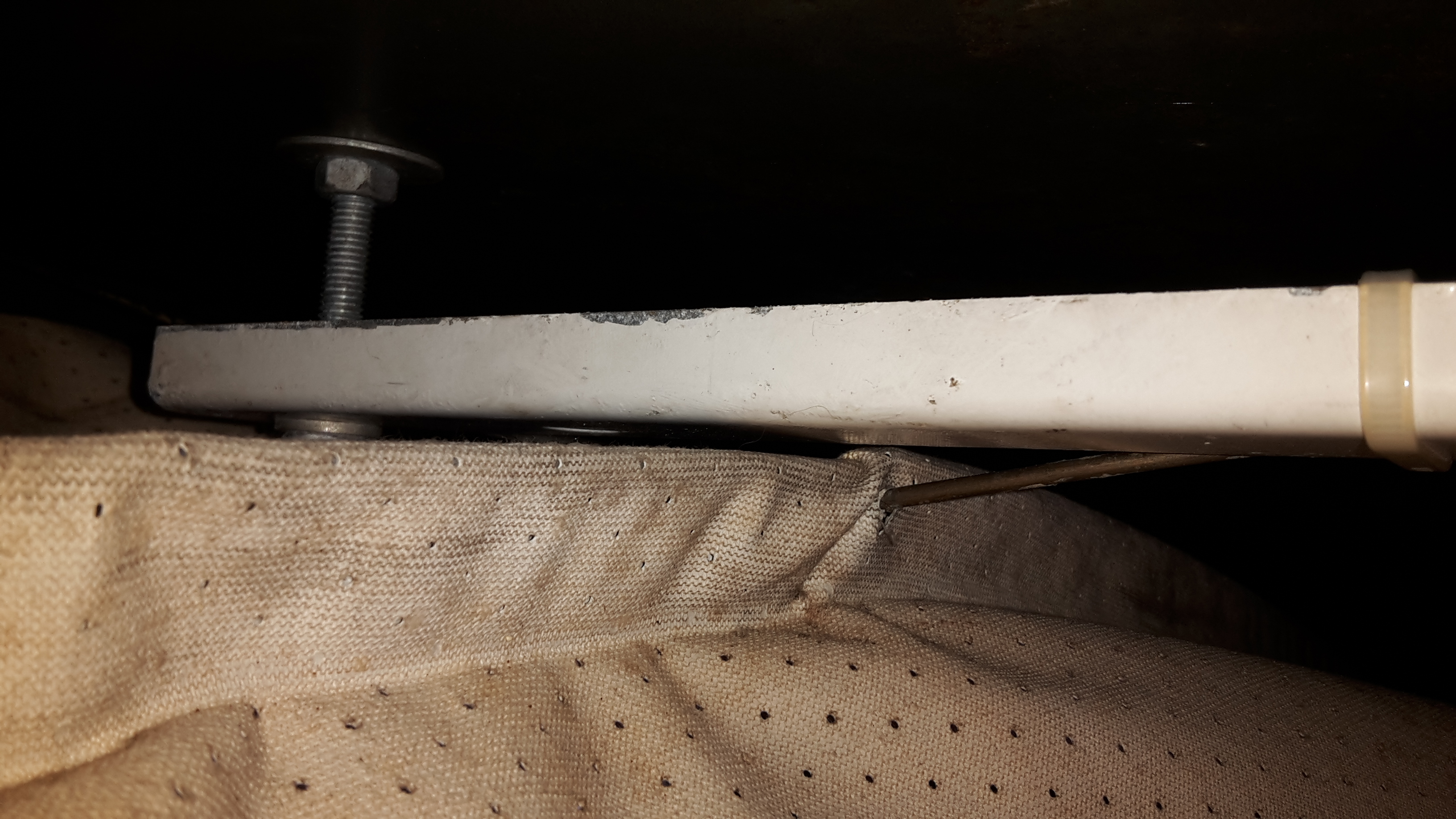 Verbaut ist ein roter Bosch Dreh-Zieh-Schalter für das Signalhorn und Blaulicht. Im Himmel sind zwei Reissverschlüsse – eine kurzer und ein langer. Dahinter ist eine U-förmige Verstärkung von der Frontscheibe bis zu dem Loch mittig im Wagendach, welches derzeit mit einer dicken Schraube verschlossen ist.