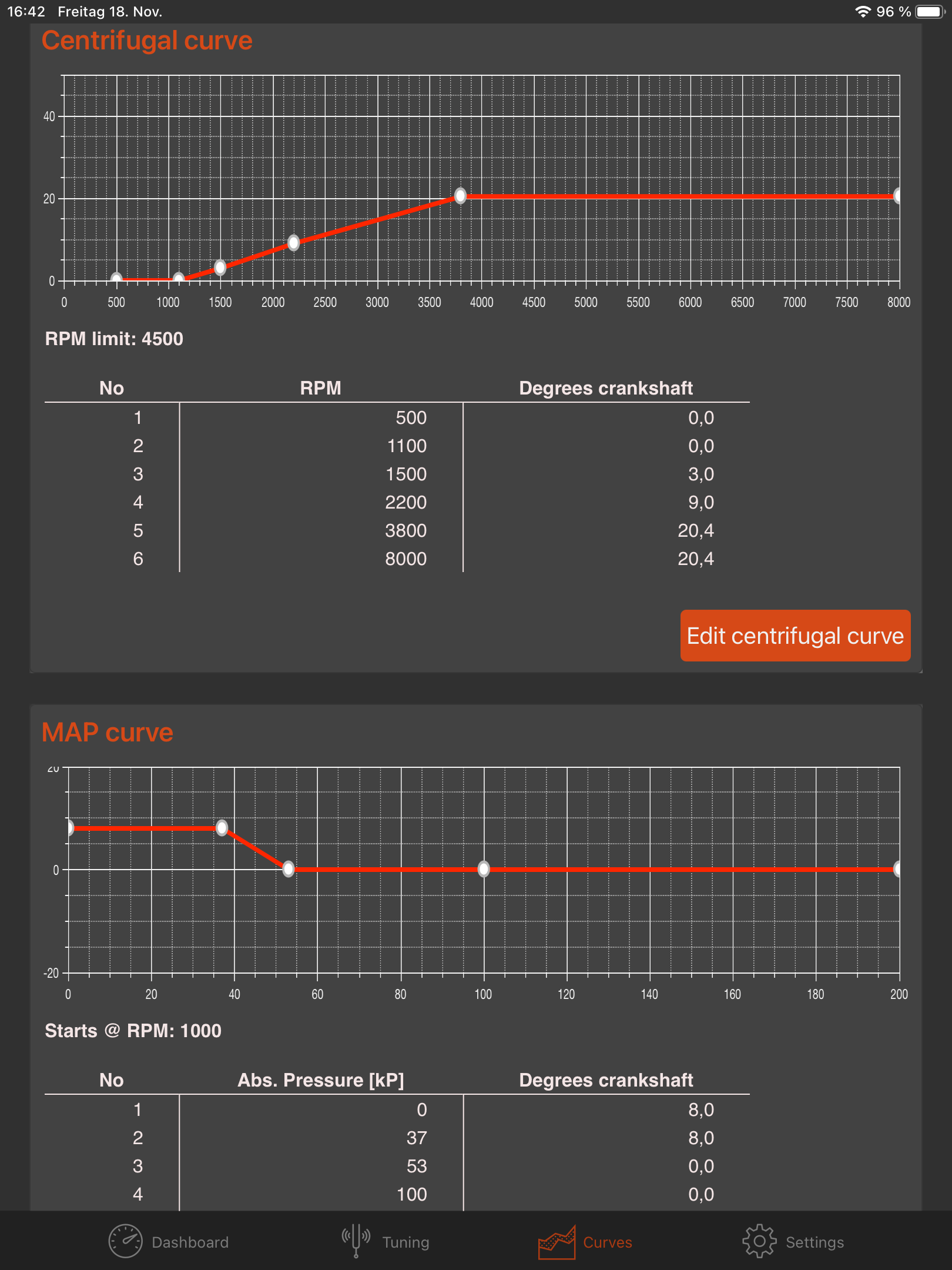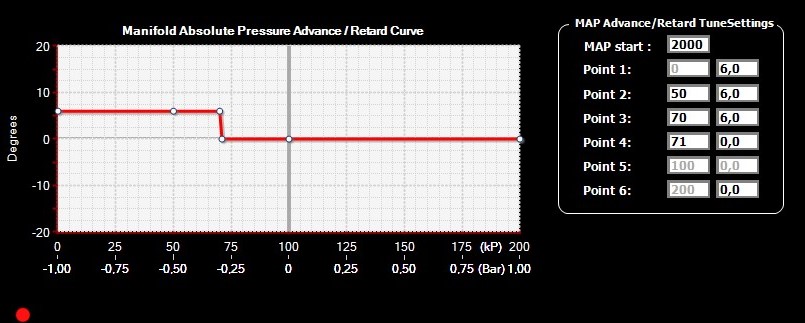 Weil der größere Hubraum bei gleicher Vergasergröße einen höheren Unterdruck erzeugt, würde die Verstellung viel zu früh einsetzen ( bei Volllast habe ich 90 kPa). Ich habe deshalb geändert auf 53 und 37 kPa, was dann so aussieht, als wäre die Kurve nach links verschoben.