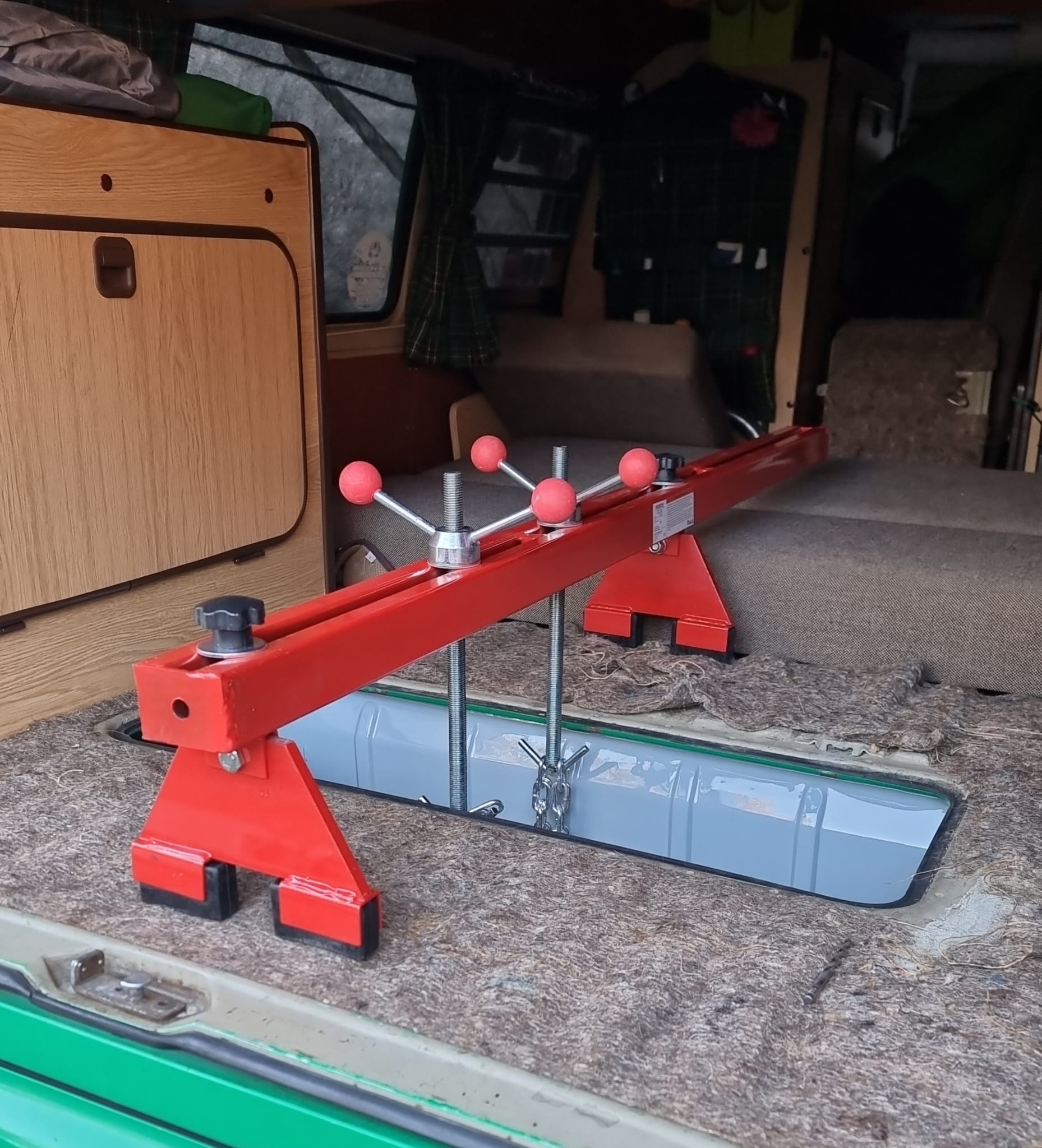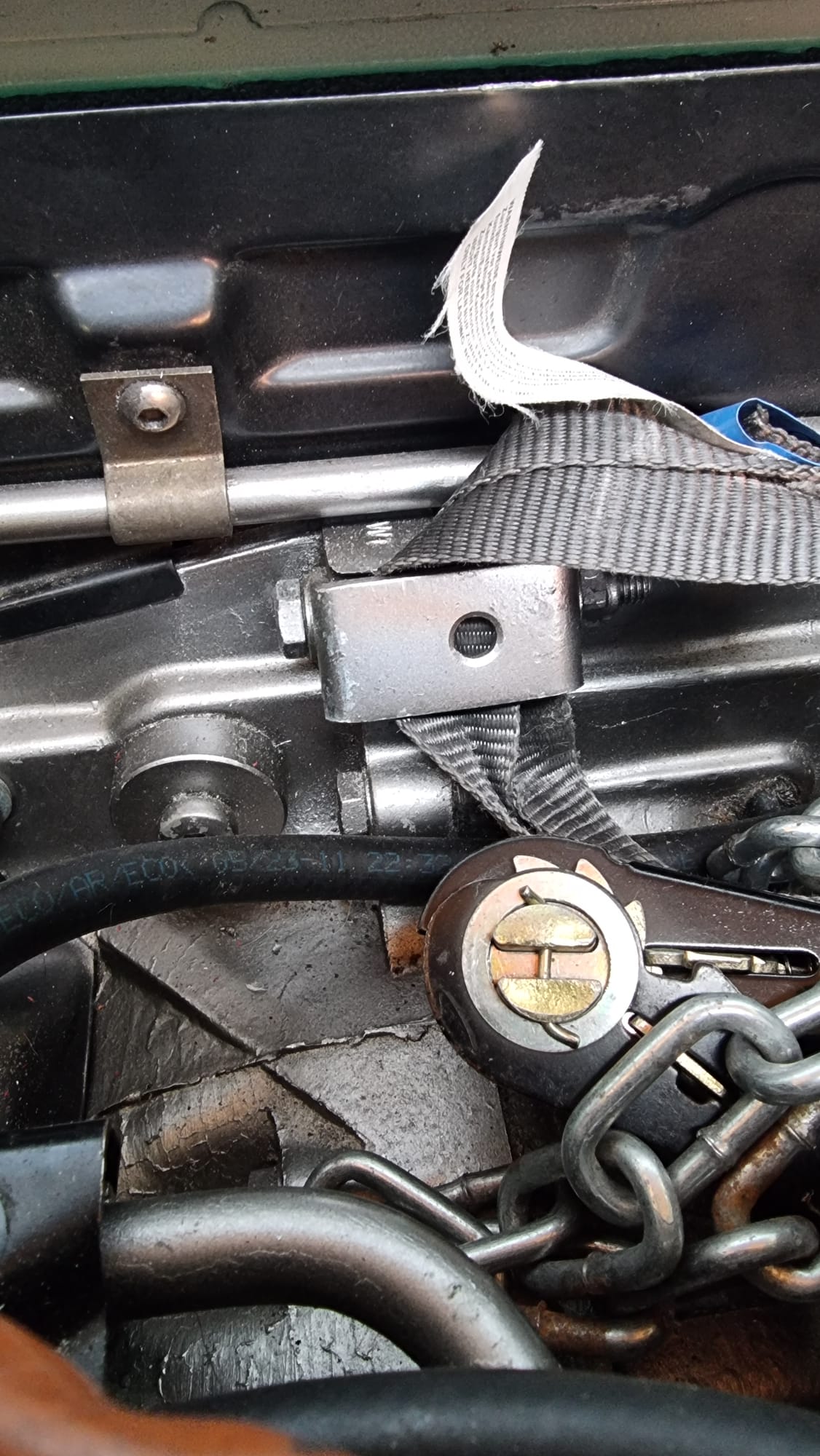 Und bei der Motorentlüftung ist auch noch eine Bohrung, in der ich schon mal einen Spanngurt gezogen hatte.