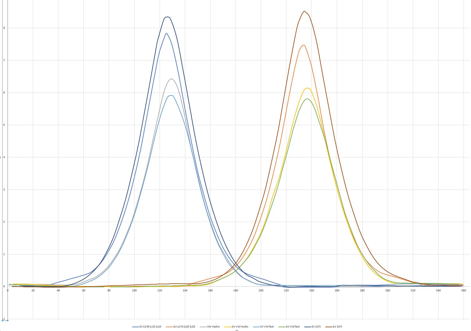 Du schreibst, dass du die Überschneidungspunkte gleichgestellt hast. Hast du auch die absoluten Winkellagen auf Kolben-OT bezogen? Das wäre noch eine wichtige Zusatzinformationen, da die Lage der Steuerzeiten ja neben der Öffungsdauer sehr maßgebend sind.