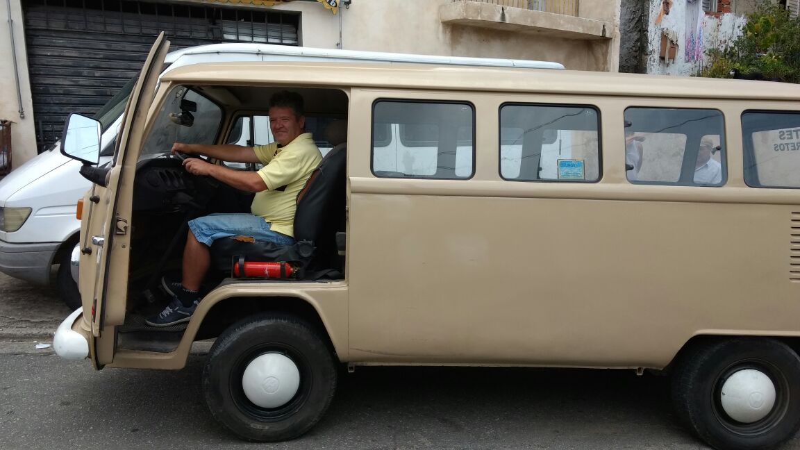 T 1,5 Baujahr 1979, natürlich luftgekühlt mit Klapptüren und kleinen Fensterchen, zu sehen ist der Vorbesitzer bei Sao Paulo/Brasilien. :thumb: