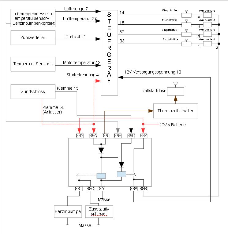 Das zweite Relais ist für die Benzinpumpe und den Zusatzluftschieber zuständig. Das zweite Relais zieht an, wenn der Anlasser über Klemme 50 mit Spannung versorgt wird, oder wenn der Benzinpumpenkontakt im Luftmengenmesser geschlossen ist. Dies dient als Sicherheitsschaltung, damit im Falle eines Unfalls die Benzinpumpe bei eingeschalteter Zündung nicht permanent läuft.