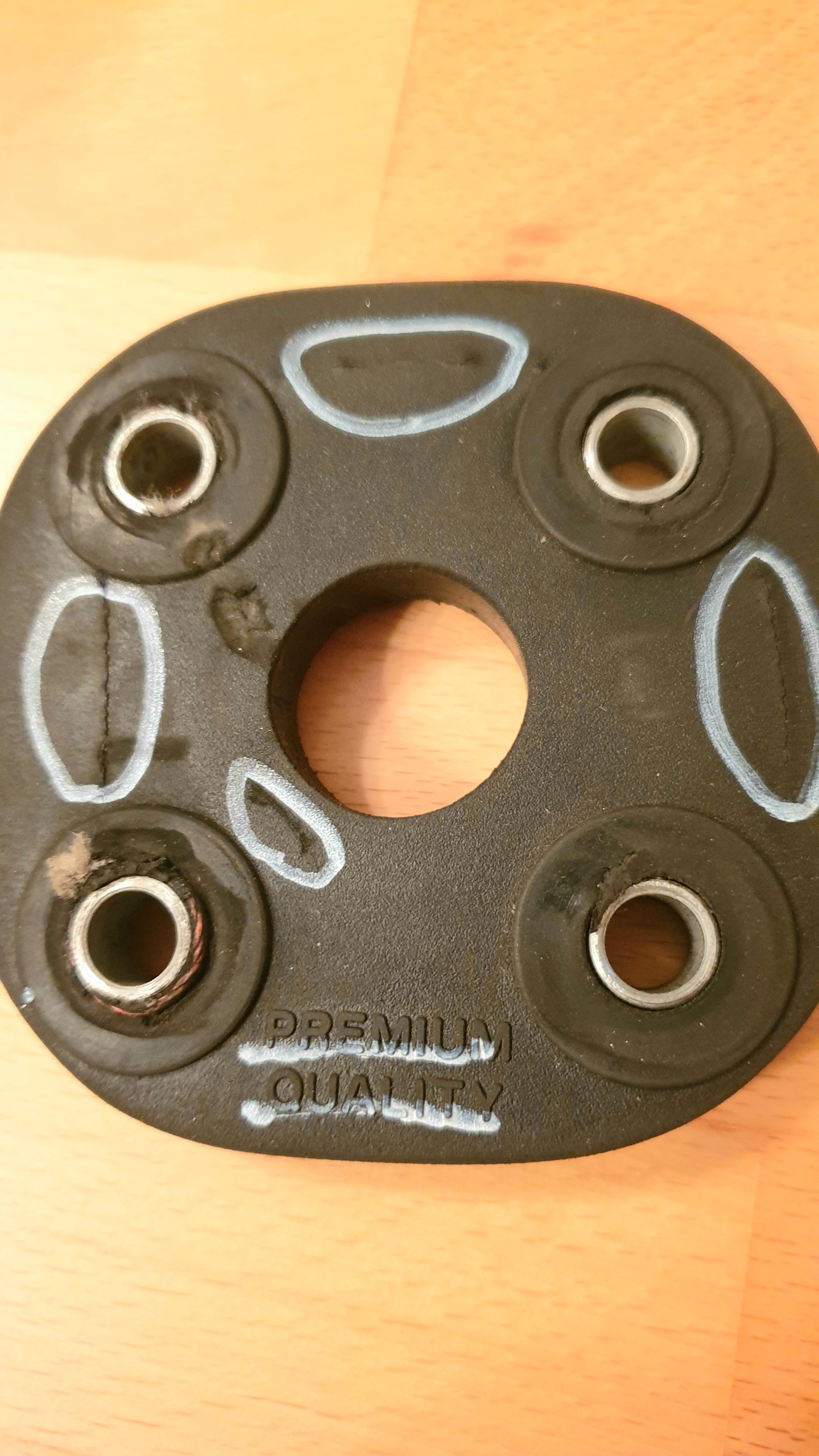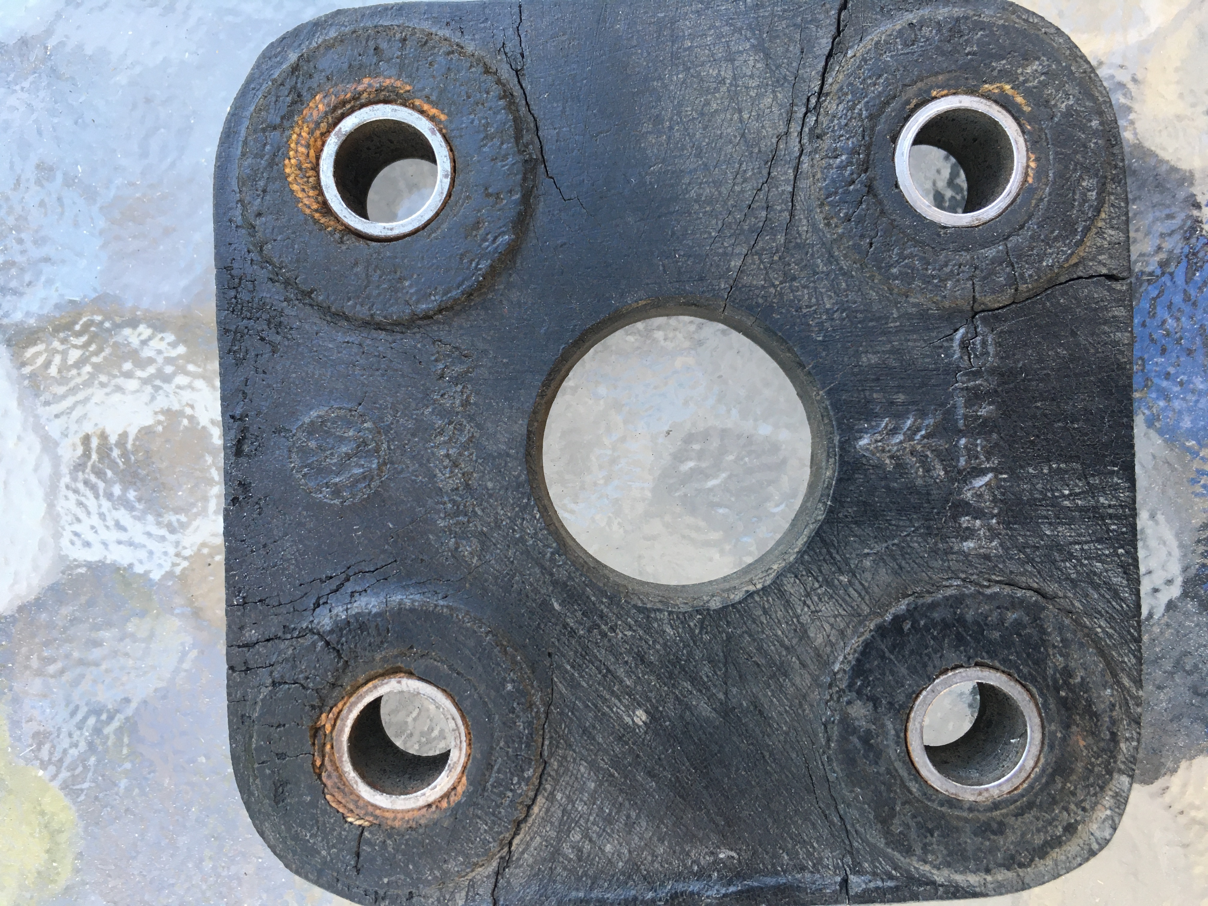 Die Hardyscheibe habe ich anschliessend ausgebaut. Sie hatte auf einer Seite mehrere leichte Risse und die Buchsen waren z.T. im Gummi schon ziemlich ausgeschlagen. Im Schnitt durch die Scheibe sieht man, daß die Gewebeverstärkung aus einem dünnen Seil besteht welches unmittelbar unter einer Seite der Oberfläche verläuft und um die jeweiligen Buchsen geführt ist. Die Risse waren genau an den Stellen an denen das Seil verläuft. Das Gummi selbst kam mir etwas zu weich vor, wobei mir da die Referenz zu einem Originalteil fehlt. Ich stelle mir unter dem Aufdruck "Premium Quality" jedenfalls etwas anderes vor. Ein Vergleich des Schnittbilds und der Gewebeverstärkung zu einer alten originalen Scheibe steht noch aus.