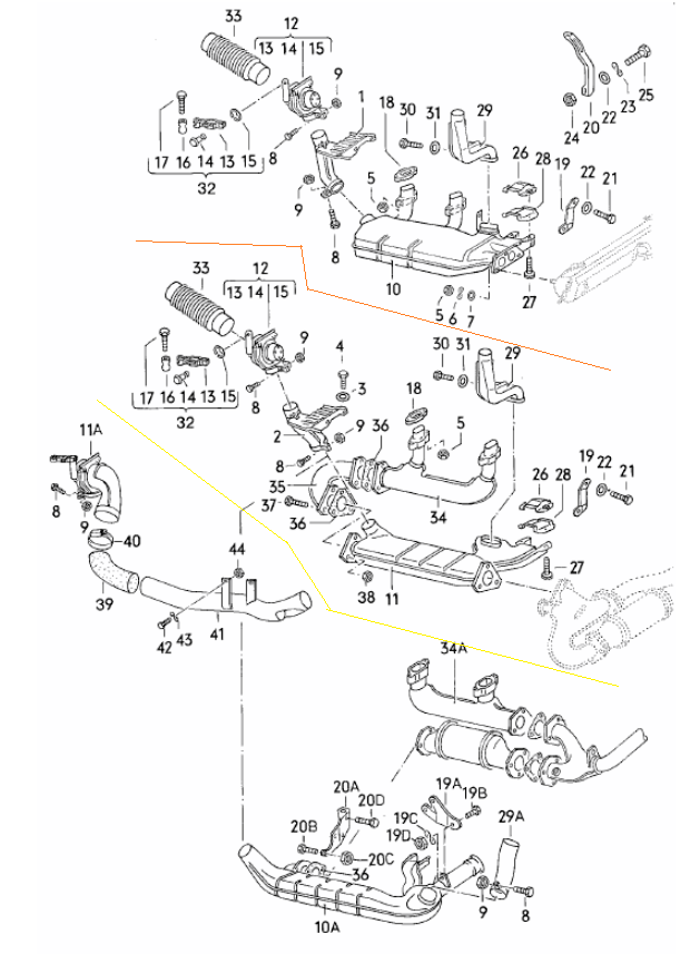 Alles oberhalb der orangenen Linie ist Europa Version, u.a. erkennbar an dem jeweils Doppelausgang ("Brille") pro Seite von Wärmetauscher zum Schalldämpfer.