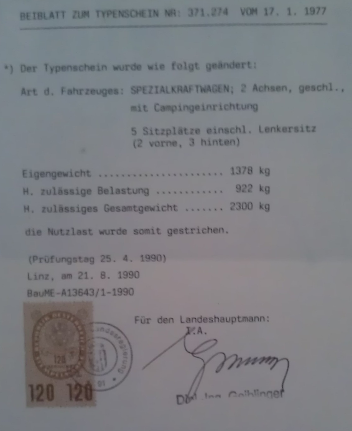 Der Bus wird wieder ein Camper, so wie er schon zugelassen war und auch laut Typenschein (das österr. Äquivalent zum Fahrzeugbrief) auch ist....