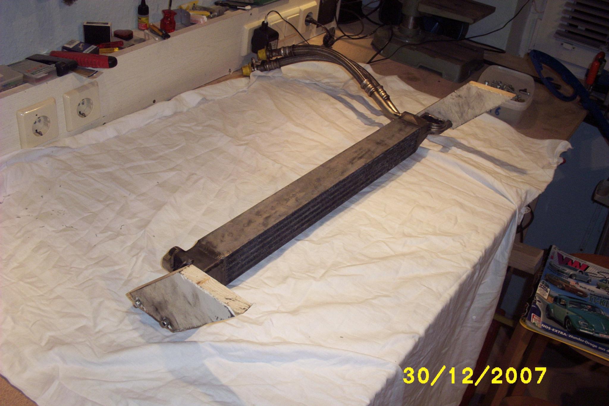Bild 1 zeigt den Ölkühler mit den als Muster angefertigten Haltern aus Holz.