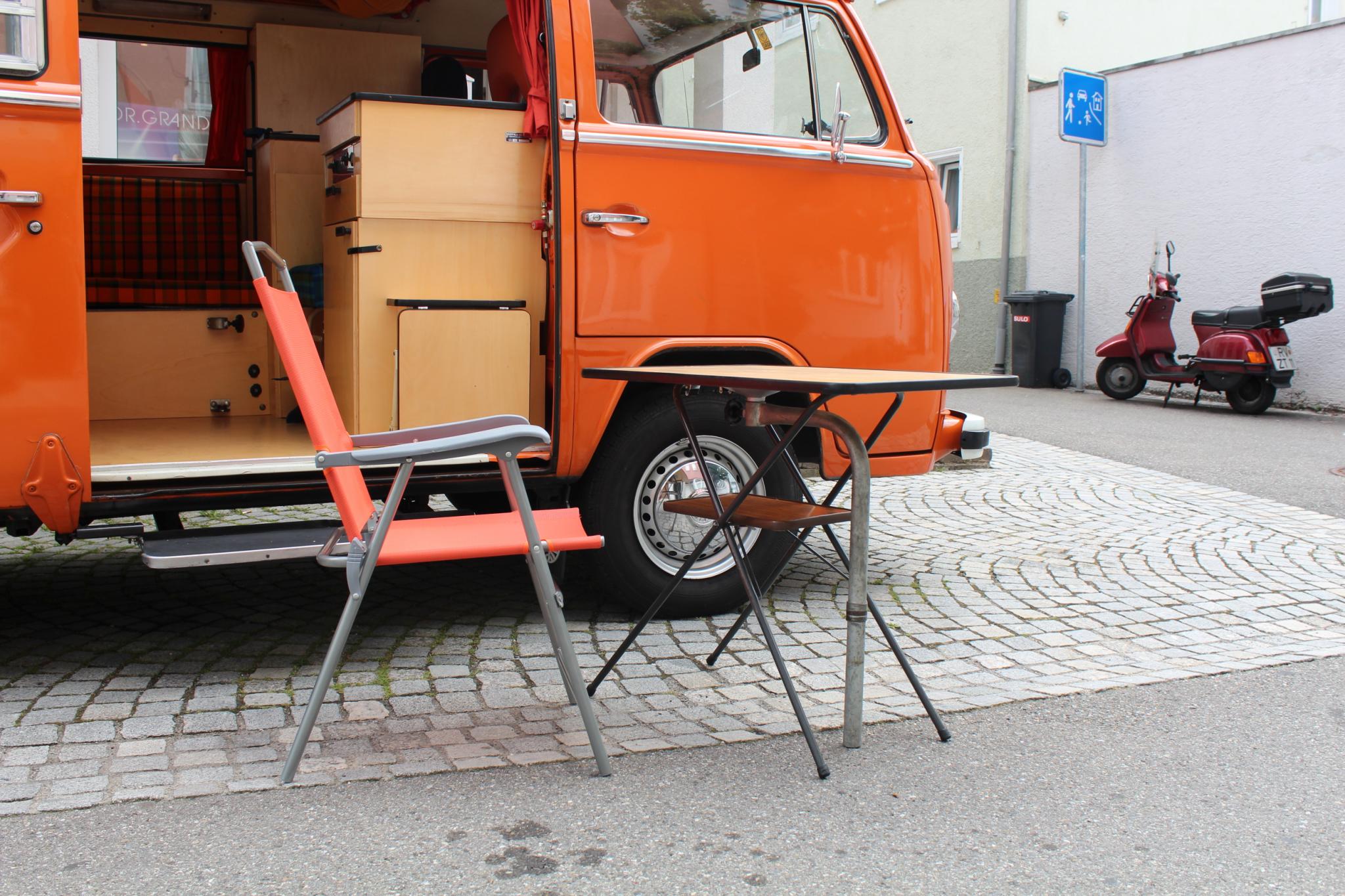 Kleines Gimmick ist die kleine Abstellfläche unterhalb des Tisches (Goldwert!) falls es oben mal wieder zu eng wird, natürlich (fast) im Westfalia Decor