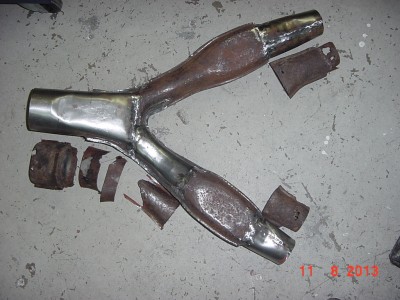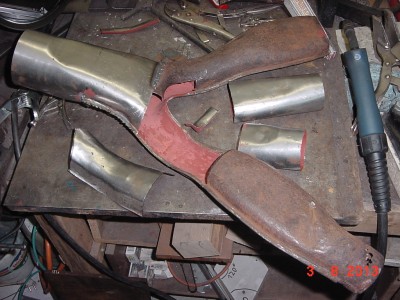 Y-Stück bis auf die schweißbaren Restbestände ausgeflext, Bleche angefertigt (mit der Stauch-und Streck- und Klopf- und Kant- Maschine) und eingeschweißt , verschliffen und lackiert – fertig!!