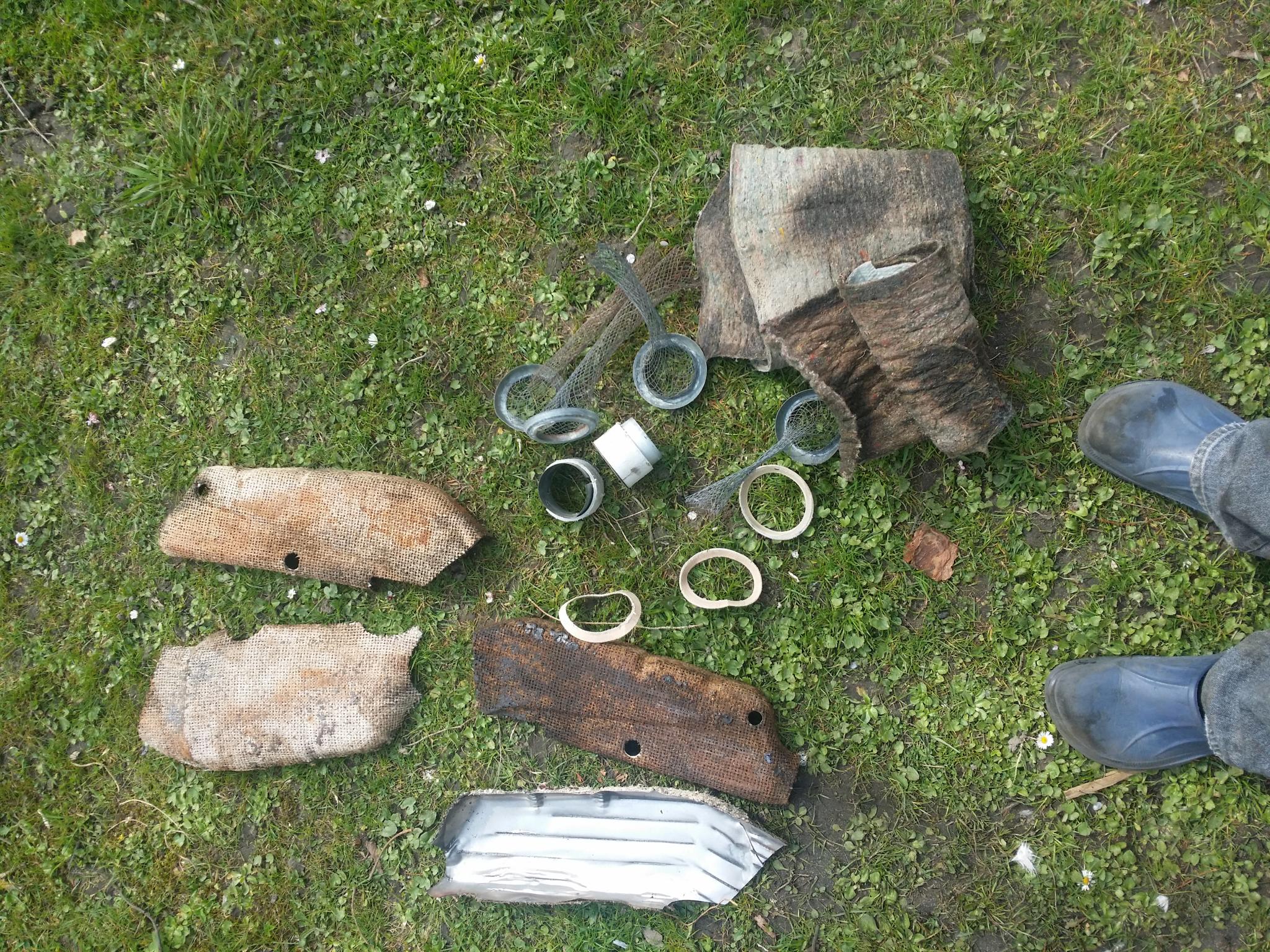 Ich habe also wie zu sehen ist neben den verdächtigen Matten aus den Wärmetauschern (getauscht gegen Glasfasermatten mit Alu-Beschichtung) nun aus Frust alles aus den Warmluftrohren rausgerissen und alles (im Freien) gut durchgeblasen. Die Fasermatten in den Warmluftrohren an sich bestehen lt. Zeichnung aus Polyesterfilz welcher lt. der damaligen Materialbeschreibung unkritisch ist. Ich habe ihn allerdings wegen möglicher Kontamination mit Asbestfasern gleich mit rausgeschmissen.