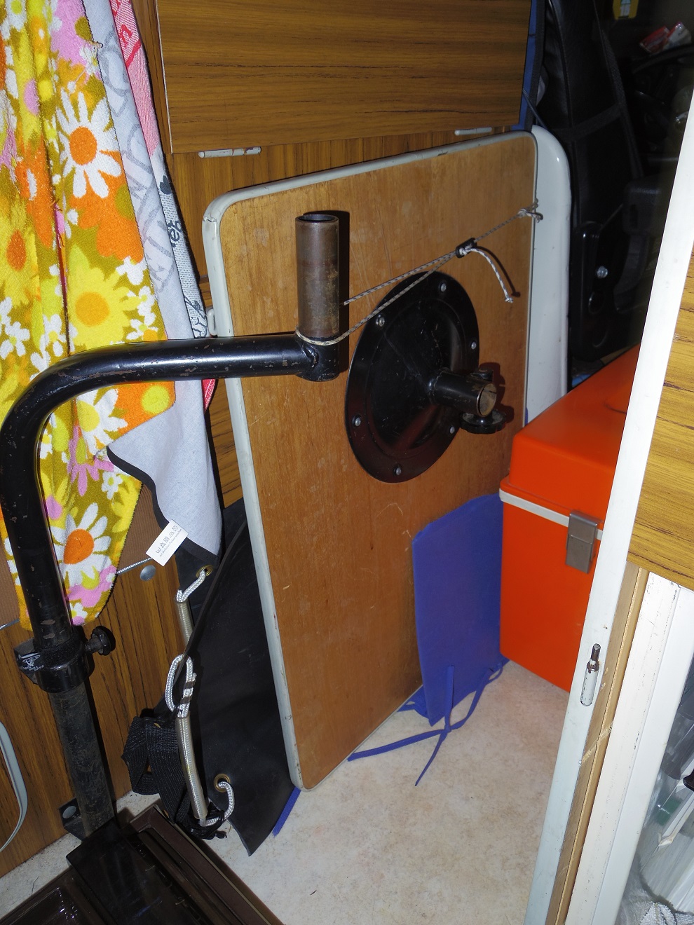 Ich hatte ihn immer auf dem Motorraum unter der Matraze, wo er zur Not auch bleiben konnte, wenn man im Bett lag. Der Tisch war ein Eigenbau, zusammengeklappt ziemlich flach und mit 'nem Rahmen außen rum unterhalb der Tischplatte, sodaß die eingeklappten Beine nicht überragten.