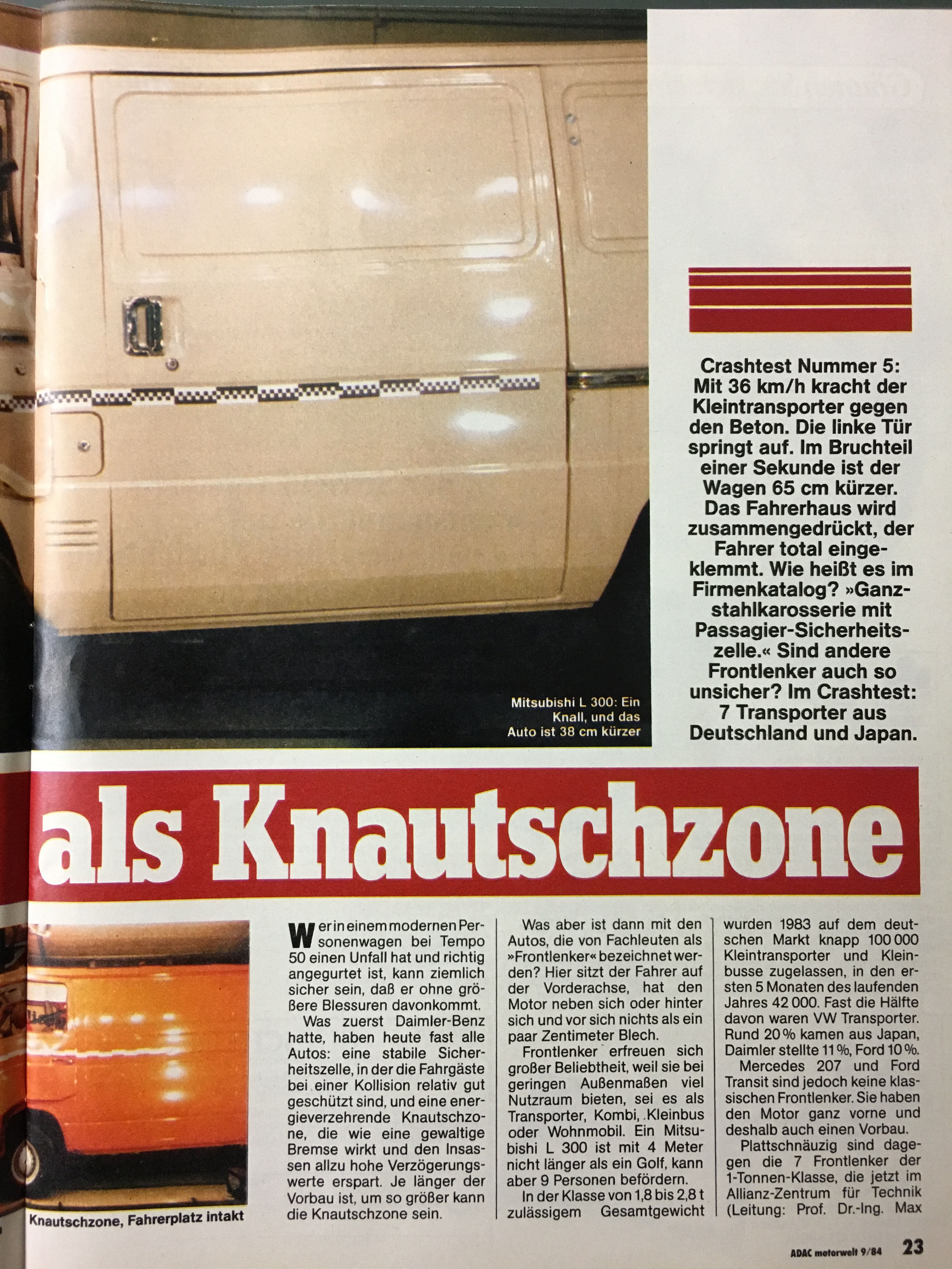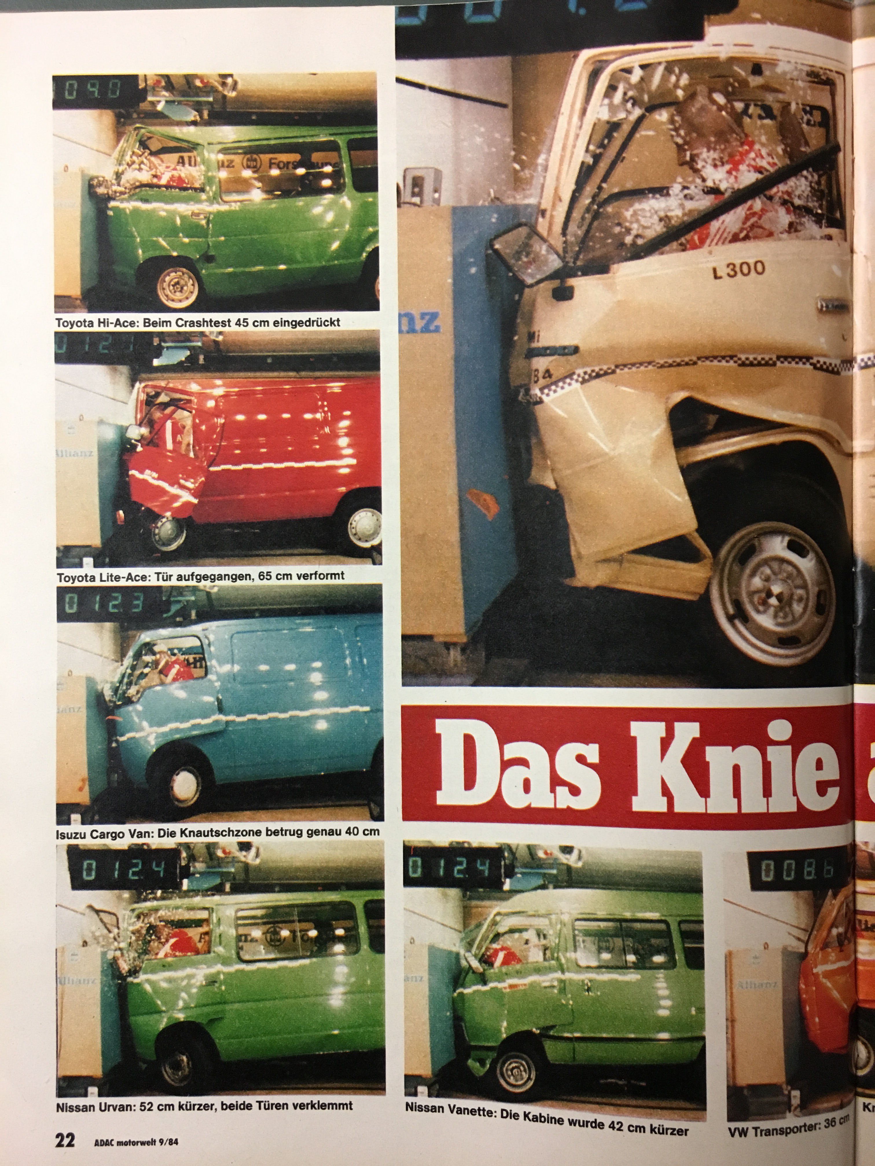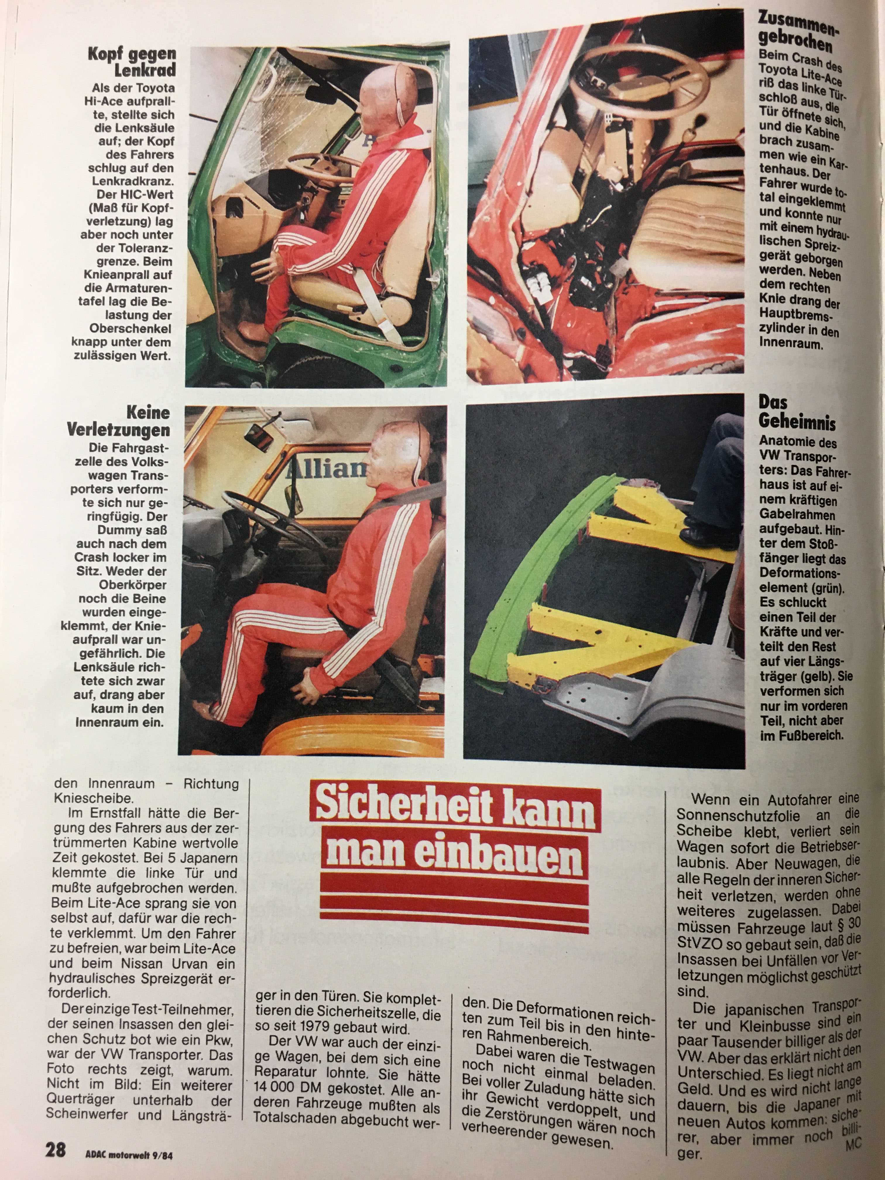 Habe auf dem Flohmarkt eine alte ADAC-Motorwelt ergattert. Interessanter Crashtest mit Kleintransportern, weit vorn: der T2. Wenn man davon ausgeht, dass die Sicherheitskonstruktion der Front des T2 ab 1972 weitgehend unverändert für den T3 übernommen worden ist, tun sich da auch 1984 noch Welten auf gegenüber den anderen Mitbewerbern. Kann man schon ein bisschen stolz sein.