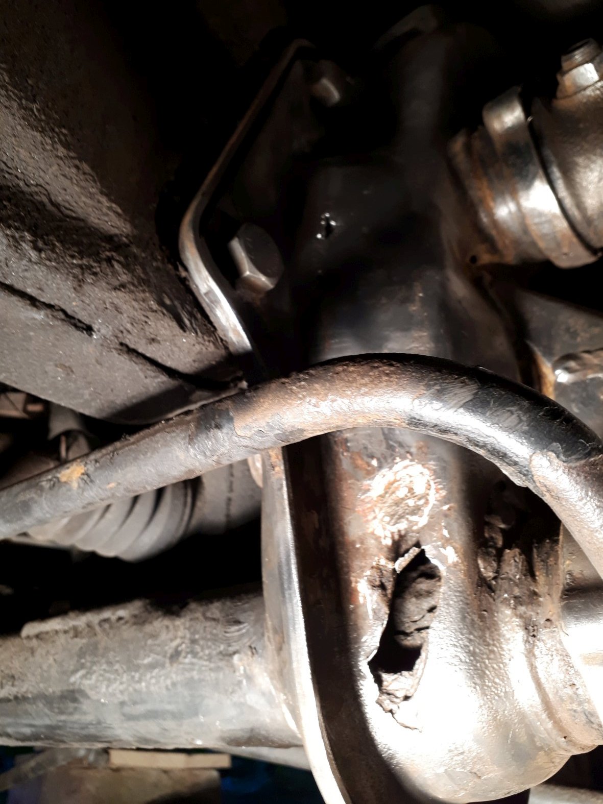 schaut euch doch bitte mal an, was ich gestern im Zuge der Instandhaltungsmaßnahmen an der Vorderachse meines VW T2 gefunden habe. Da gähnt jetzt ein großes Loch, wo vorher noch alles ganz normal ausgesehen hat. Nach der Behandlung mit der Flex mit Drahtbürste, schaut das jetzt so aus: