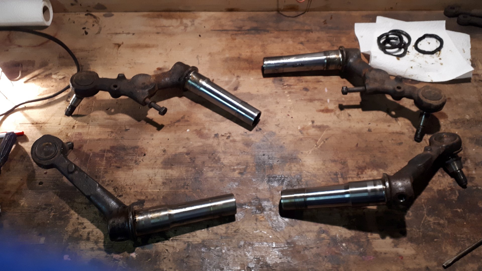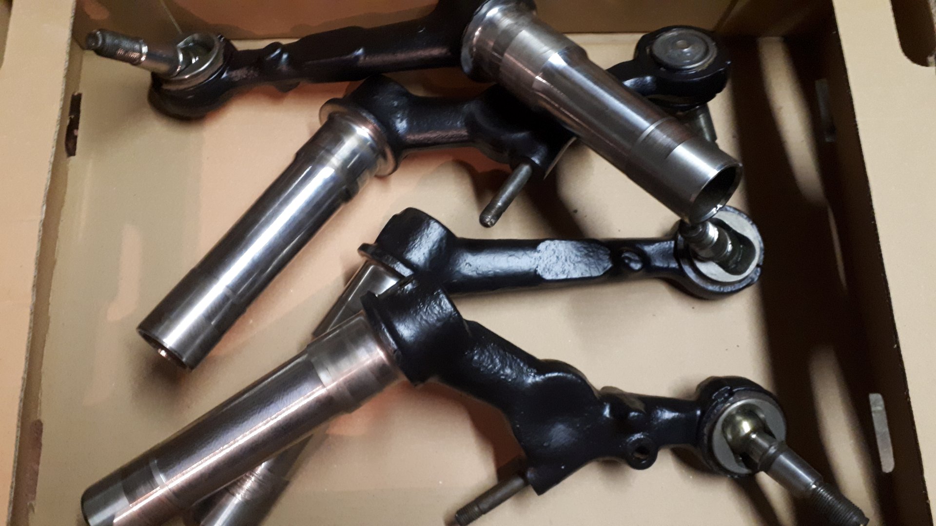 Mit den Tragarmen und den neu erstandenen Tragarmkugelgelenken bin ich dann zum Mechaniker gegangen: Umpressen. 1h Arbeitszeit. Hier ein Foto der alten und behandelten Tragarme vor dem Besuch beim Mechaniker, also noch mit den alten Kugelgelenken drinnen: