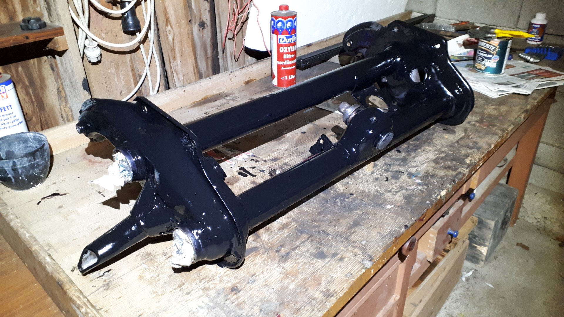 Hier die frisch lackierte Achse:
