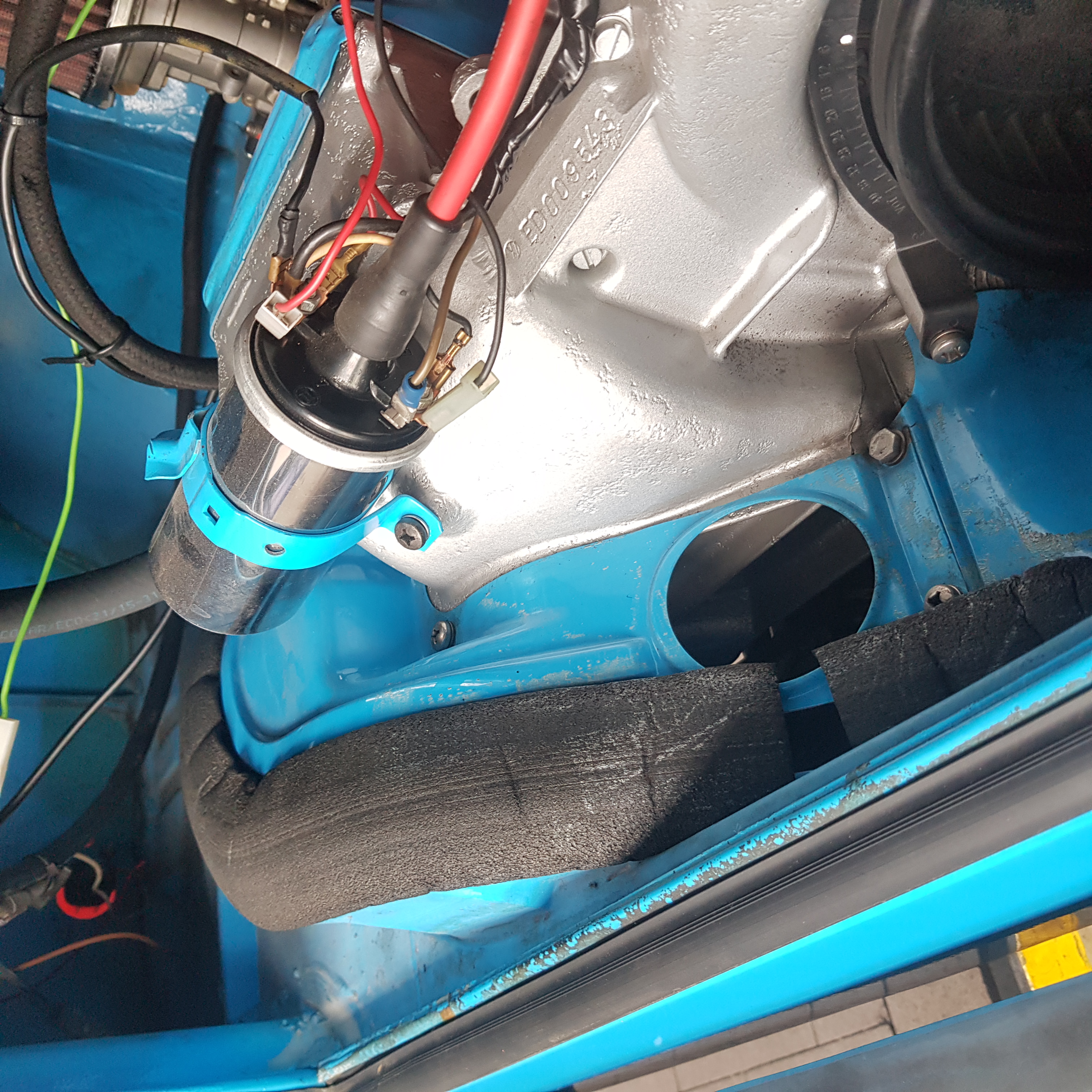 (Im Bild fehlt das Rohr durch das Loch hoch in den Motorraum)