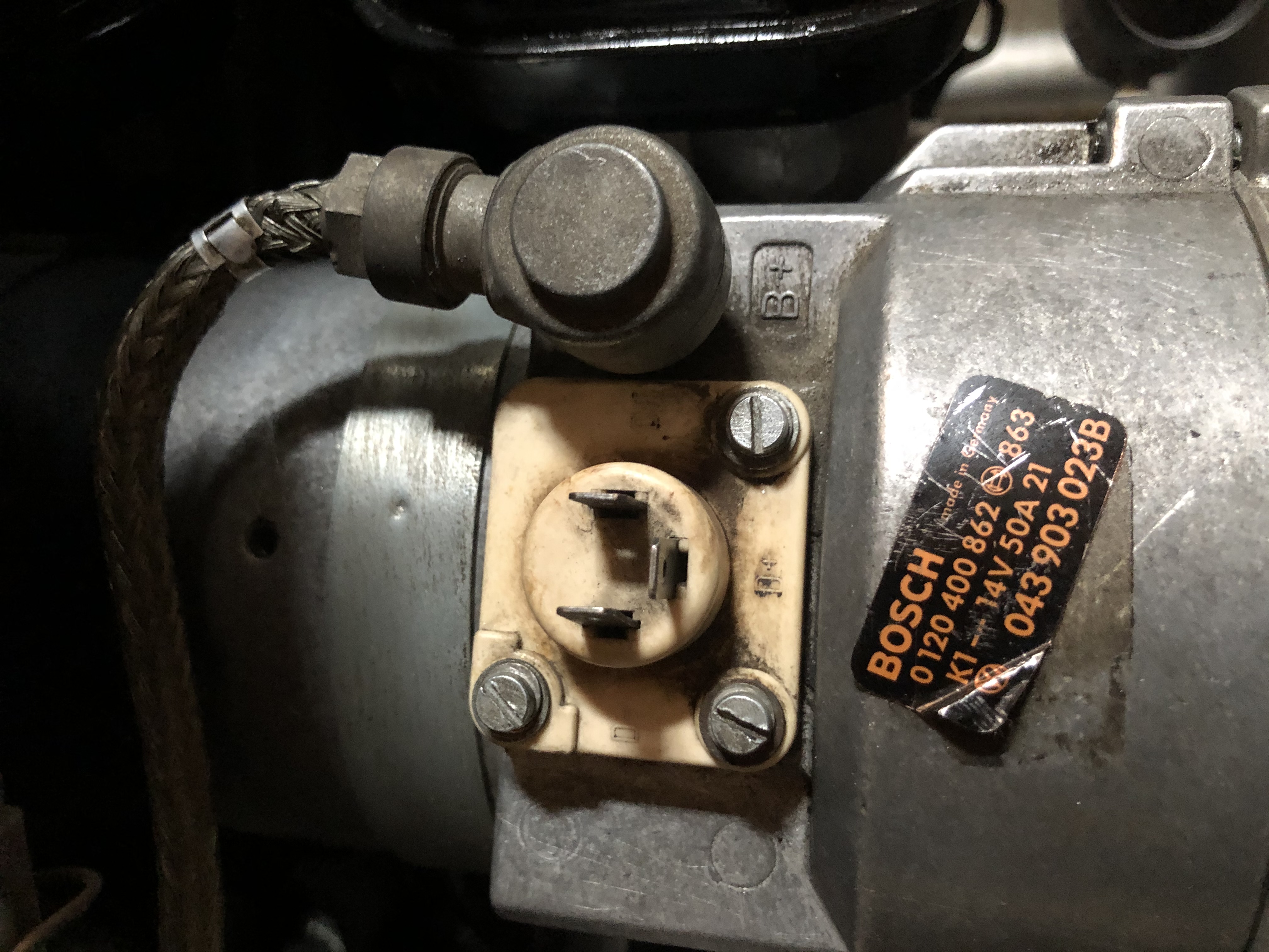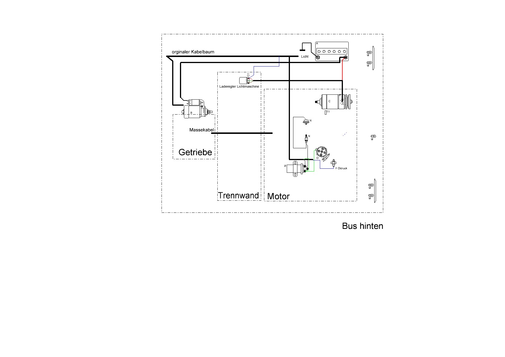 Vom Hauptkabelbaum geht ein schwarzes an Klemme 15 und ein blau/grünes an den Öldruckschalter und ein blaues an den Regler, das entweder an Klemme 61 oder mit D+ zusammen angeschlossen wird.