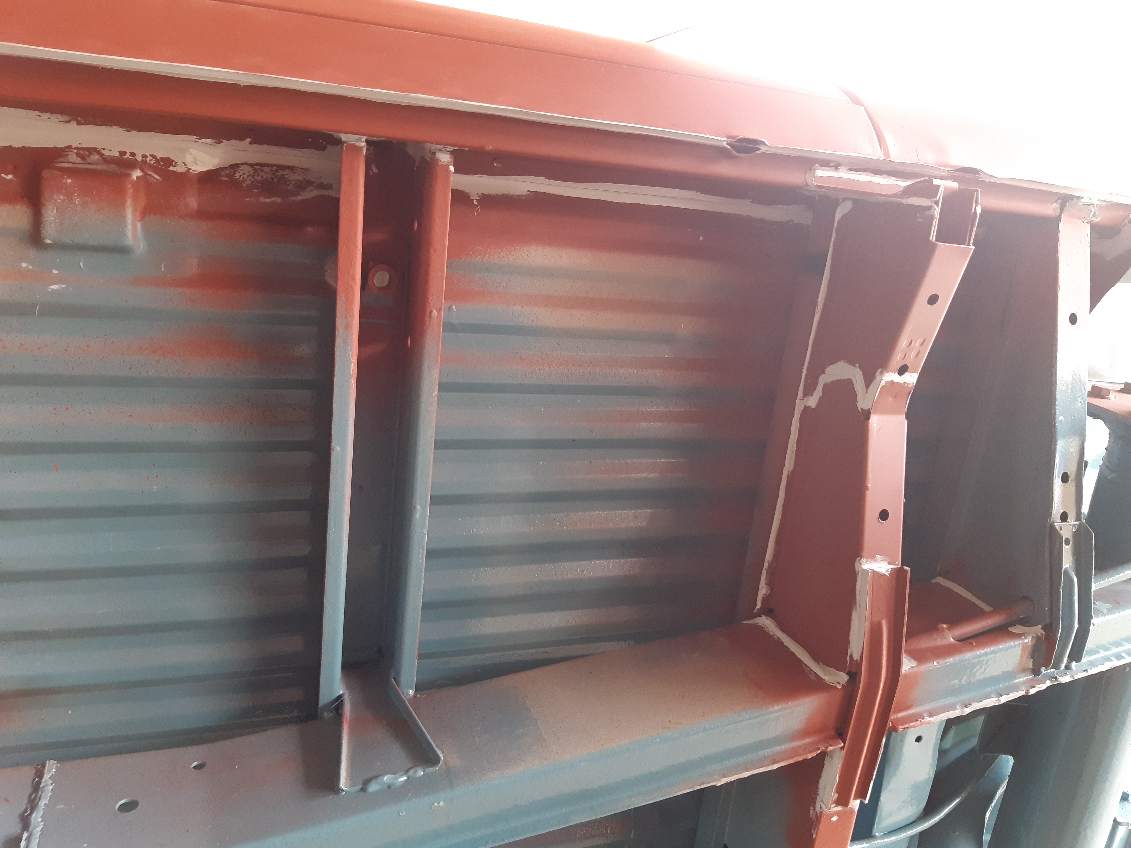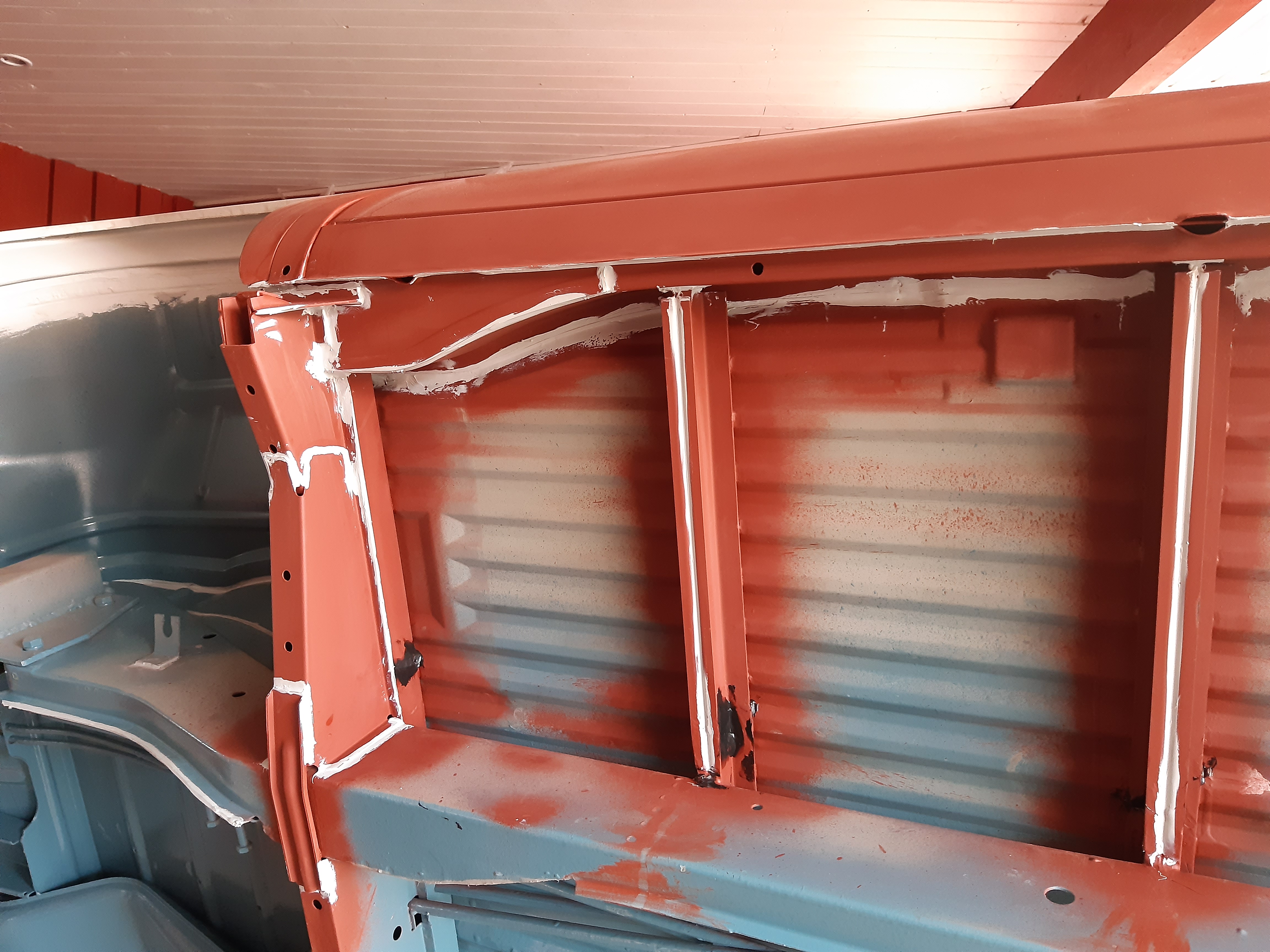 Nein, in meinen Bildersammlung findet sich dazu nix, da a) wurde nur wenige Blechecken ausgetauscht und b) noch intakten Dichtmassen wurden nicht rausgekratzt und c) der Oldtimer-Lackierer hatte schon kompliziertere Fahrzeuge in seine Kabine und d) ich mir für den Reise-Bulli keine Show&Shine Lackierung verabredet/geleistet habe :mrgreen: (bei meinem Karmann sieht es da anders aus)