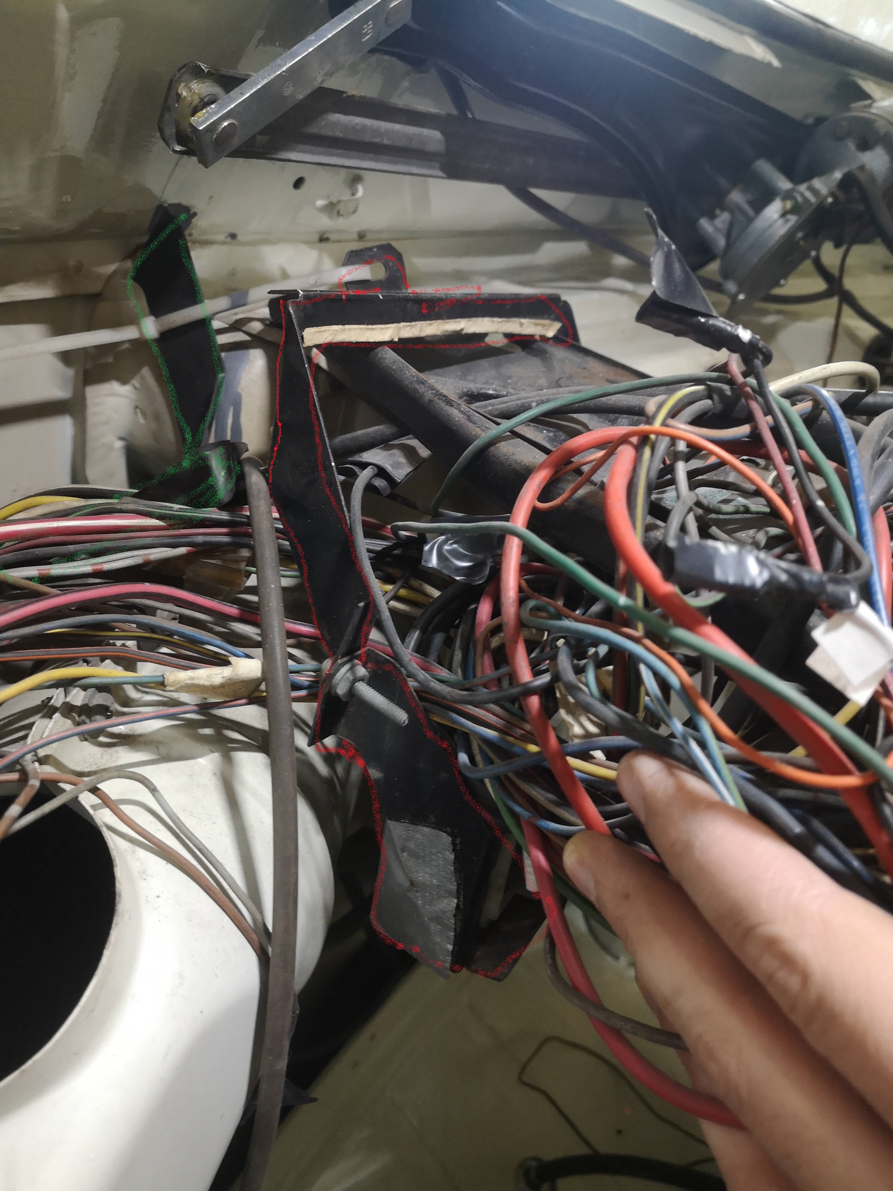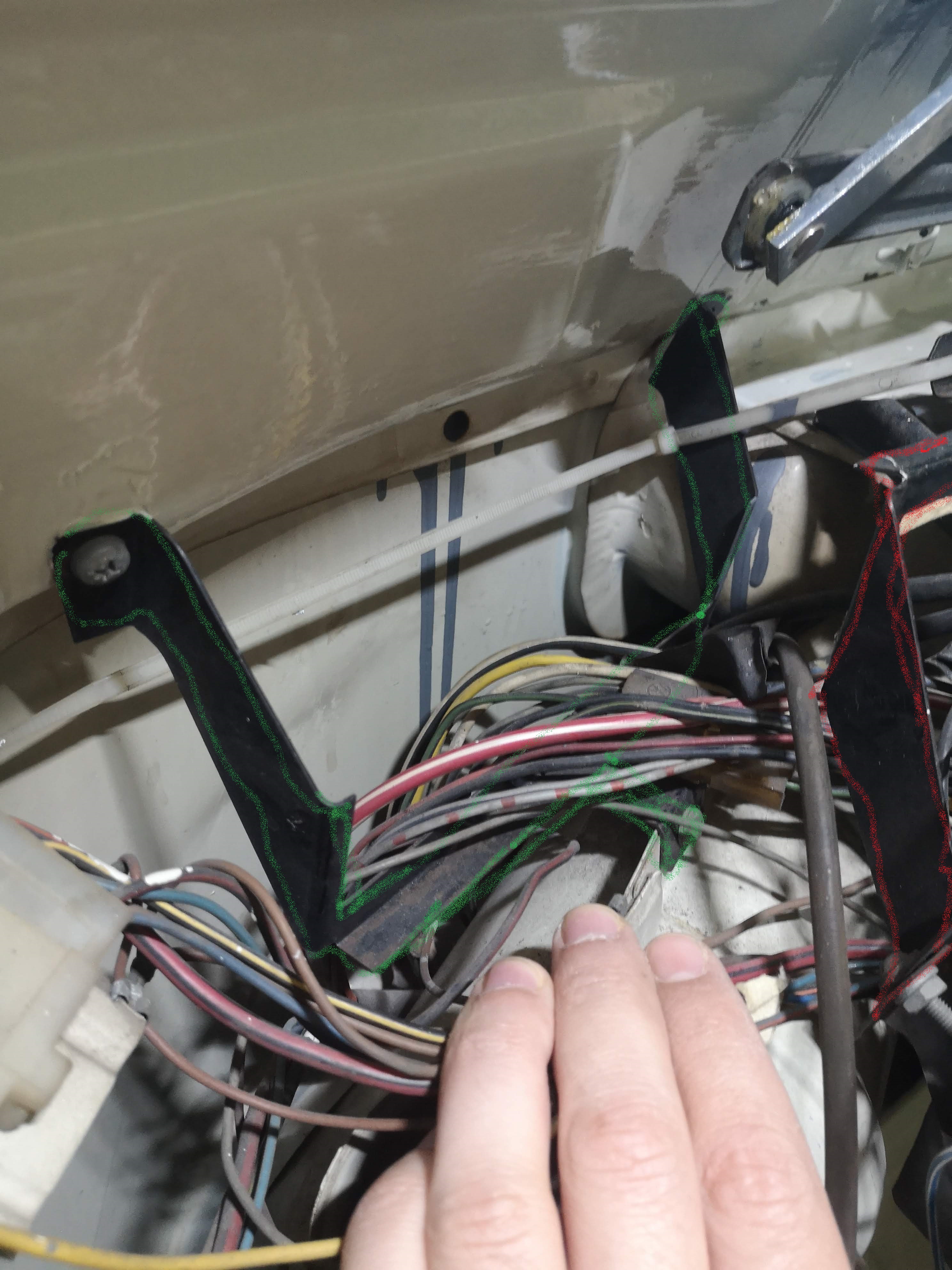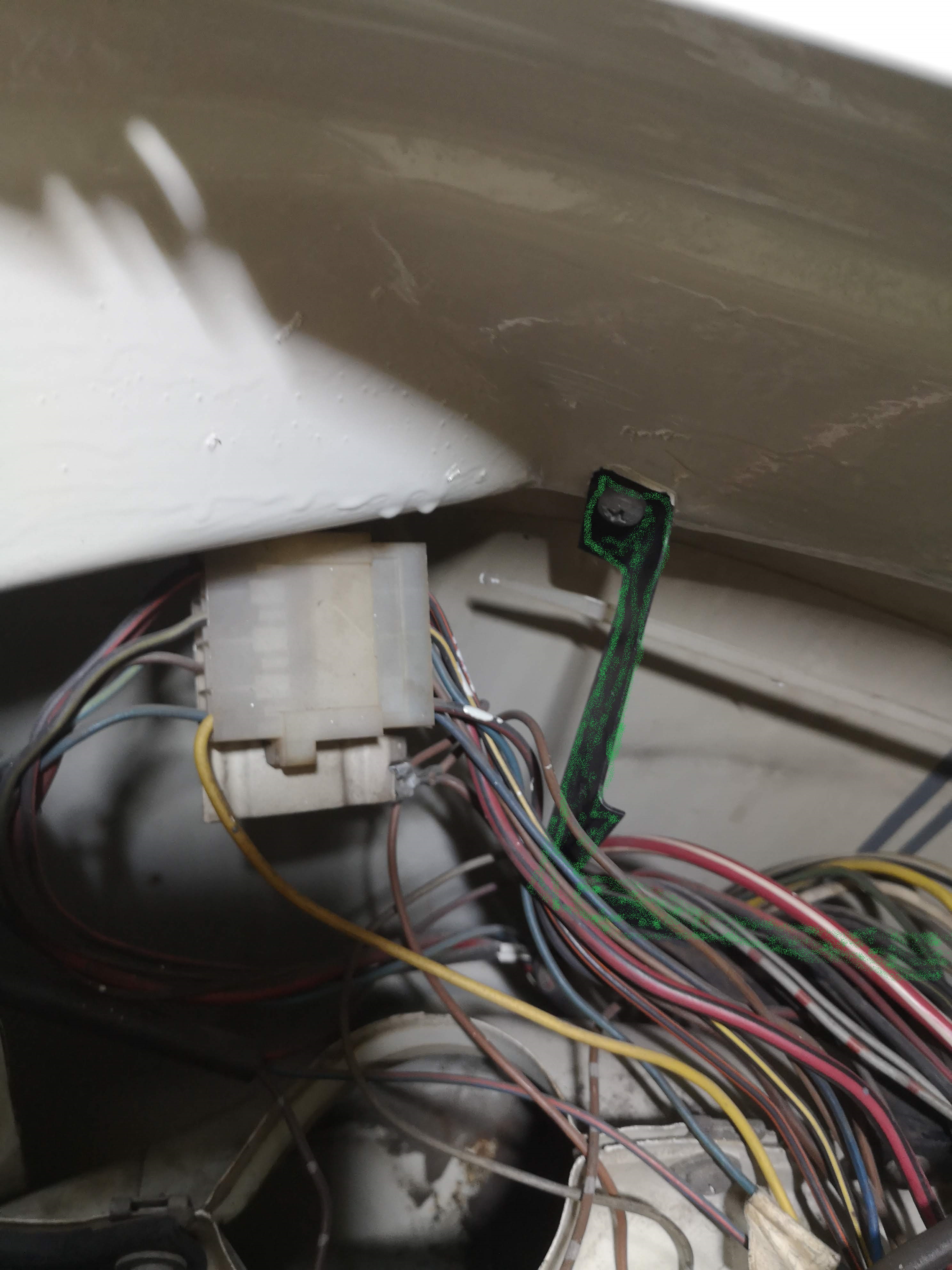 Weiter links ist zusätzlich eine weitere Halterung mit zwei Schrauben am Blech angeschraubt. Da hängt aber nichts dran. Evlt. ein Relikt aus alten Zeiten oder gehören die Teile zusammen? Vielleicht hat jemand ein Bild wie das sauber verkabelt auszusehen hat.