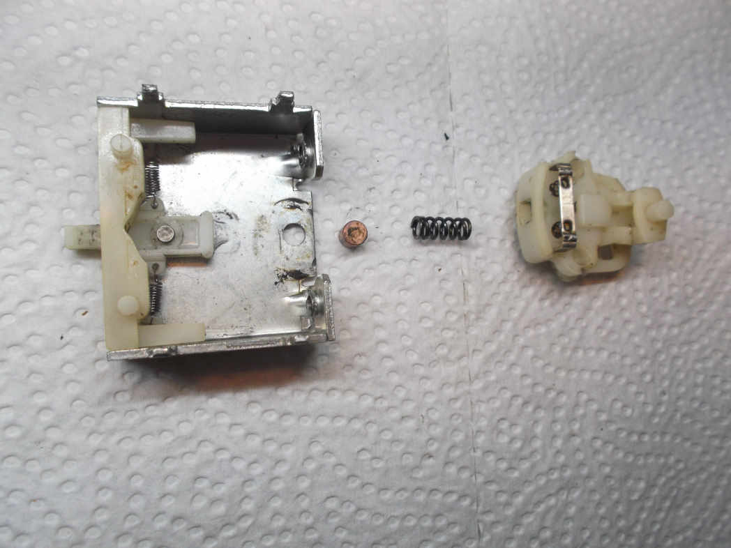 Soweit die Teile des Innenlebens. Habe jetzt das Ganze mal mit vielen Anläufen (aber noch ohne Schmierfett) zusammengesetzt, aber es hakt, und die Federspange des Hebels wird beim Versuch zu blinken auch nicht gespannt. Da stimmt was nicht! Ich weiß aber nicht weiter und es gibt natürlich vom Innenleben dieses (sündhaft teuren) Schalters keine Bilder. Meine Fragen sind konkret: Läuft der kleine Kupferzylinder wirklich mit seiner Oberfläche im Plastik nach links und rechts und wird dabei von der starken eingelassenen Feder gleichmäßig angedrückt? Kommt mir komisch vor, dass dabei die scharfen Kanten des Zylinders auf dem Plastik laufen, macht formtechnisch aber Sinn. Und noch wichtiger: Wodurch wird eigentlich die Federspange im Hebelgehäuse angespannt. Ihr könnt jetzt sagen: Hättest du mal...! Warum hast denn...? Aber das Ding ist nun mal offen und ich will den vorher bis auf die Lichthupenfunktion einwandfreien Schalter wieder beleben. Und ums Wiederbeleben geht's ja eigentlich sowieso in unserem Hobby ;-)