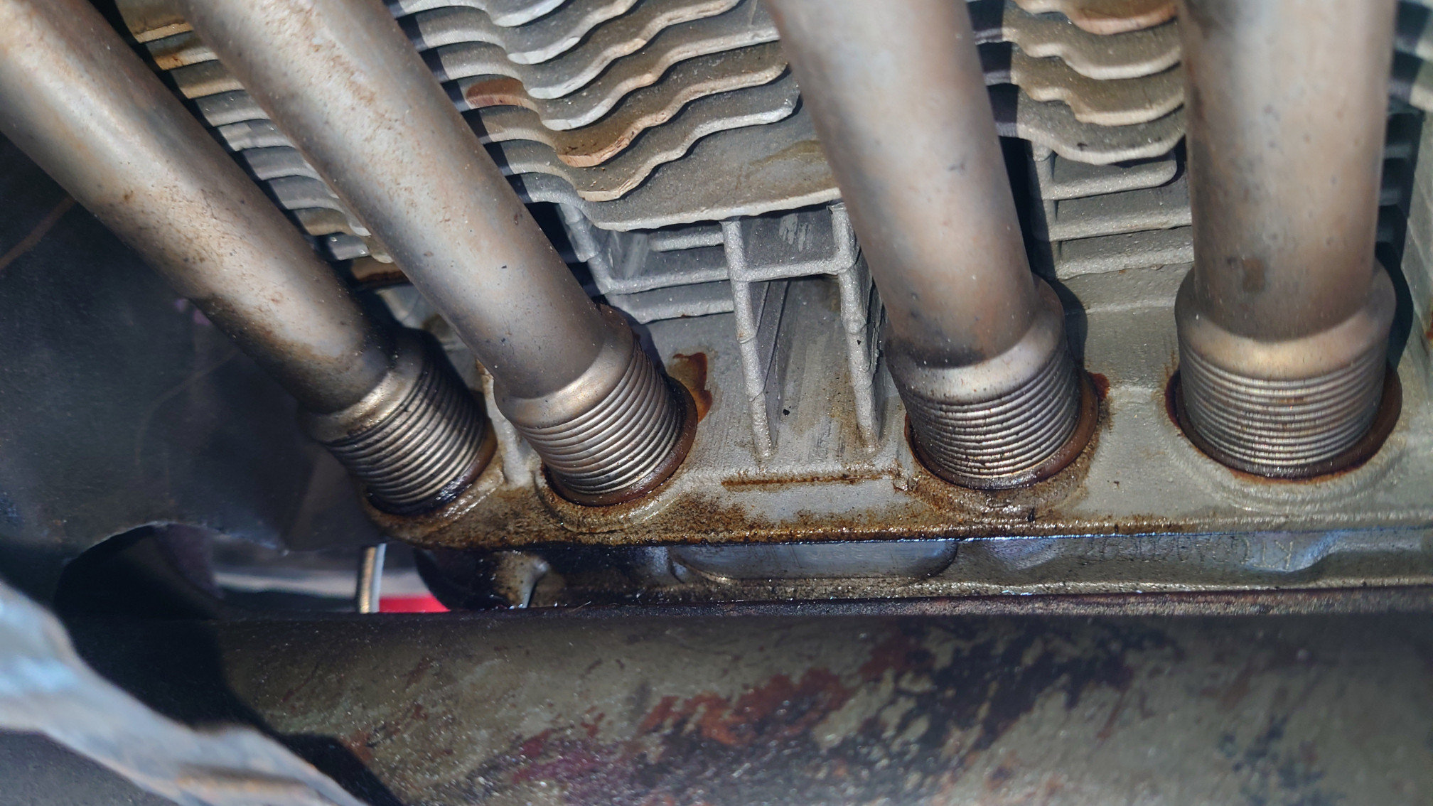 Auf der Suche nach dem "Leck" habe ich in den Ventildeckeln die obere Haelfte einiger Stößelschutzrohr Dichtungen gefunden (siehe Foto). Sieht nach Silikondichtungen aus.