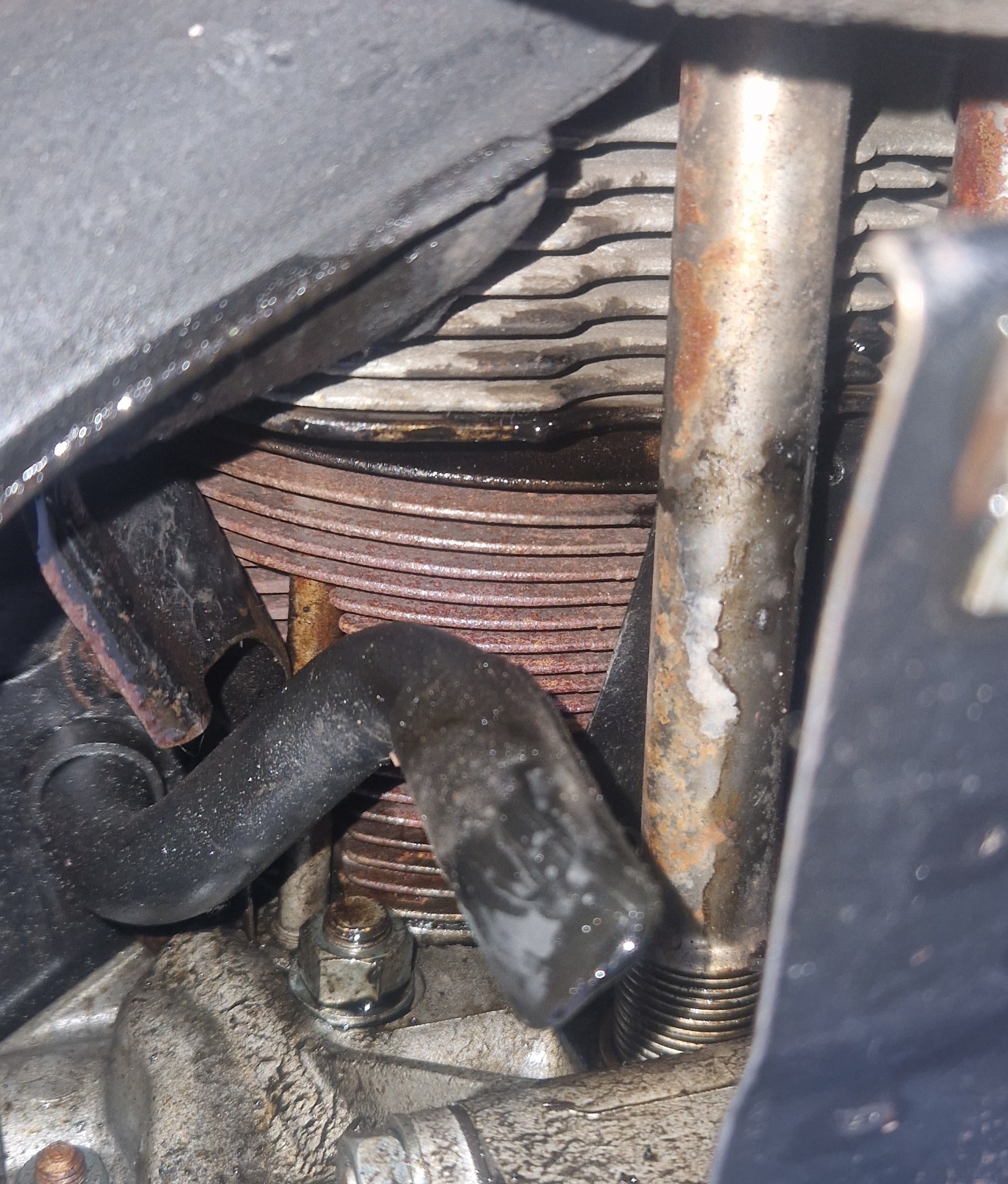 Wo könnte das Öl am Zylinderfuß und zwischen Zylinder und Kopf herkommen? Evtl. mal die Köpfe nachziehen? Der Schlauch zwischen Öleinfüllstutzen und Luftfilter (Kurbelgehäuseentlüftung) ist noch alt und etwas feucht, den müsste ich mal tauschen. Aber sooo viel Öl kommt da doch auch nicht an, oder?