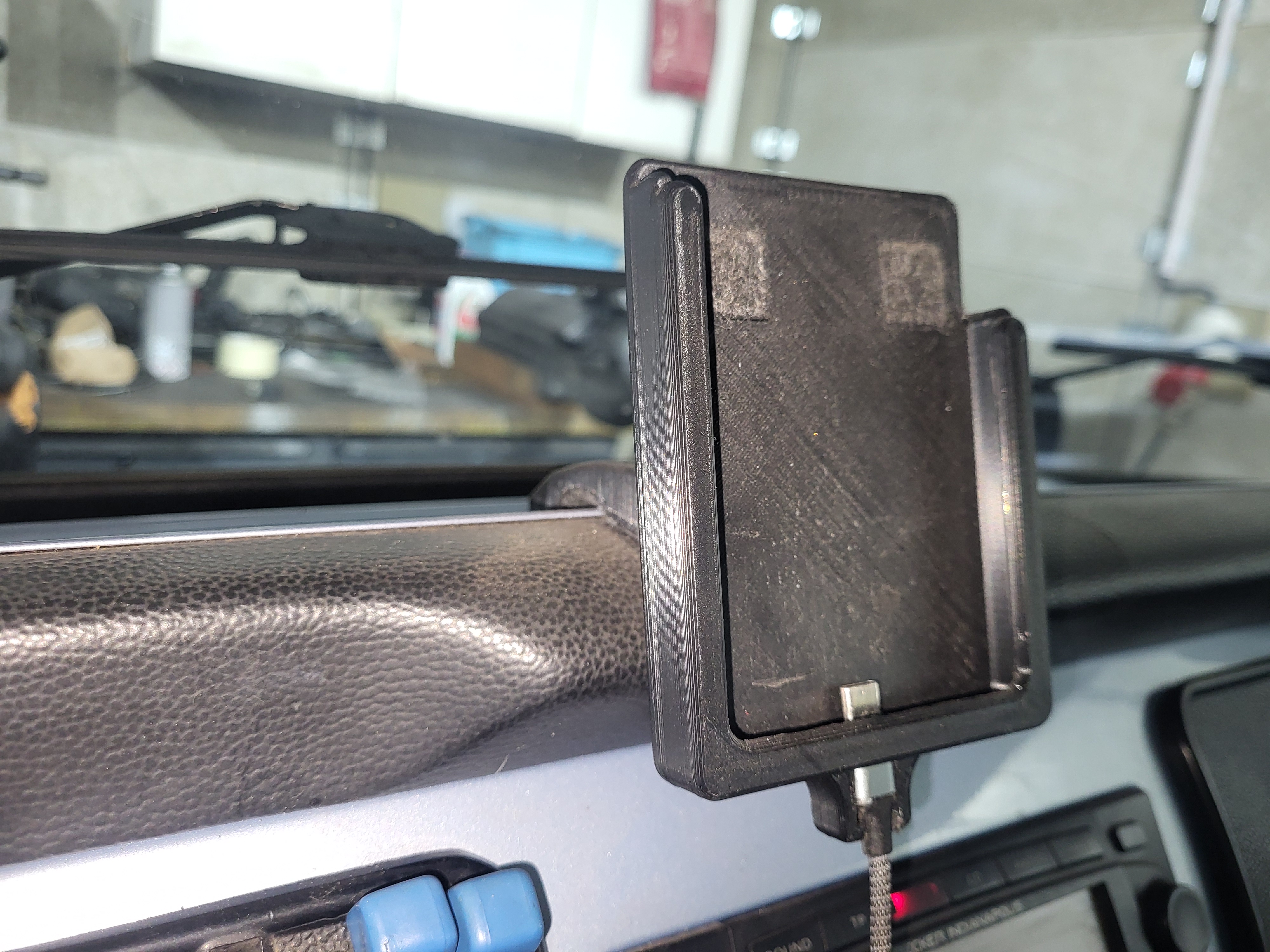 Sie besteht aus zwei Teilen die miteinander verklebt werden müssen. Der Bügel kommt aufs Armaturenbrett, in etwa mittig und wird dort durch eine der vorhandenen originalen Bohrungen für den Lautsprecher fixiert. Er legt sich dann bündig um die Polsterleiste des Armaturenbretts. Alle Auflageflächen sollte man mit selbstklebendem dünnem Moosgummi oder Filz bekleben.