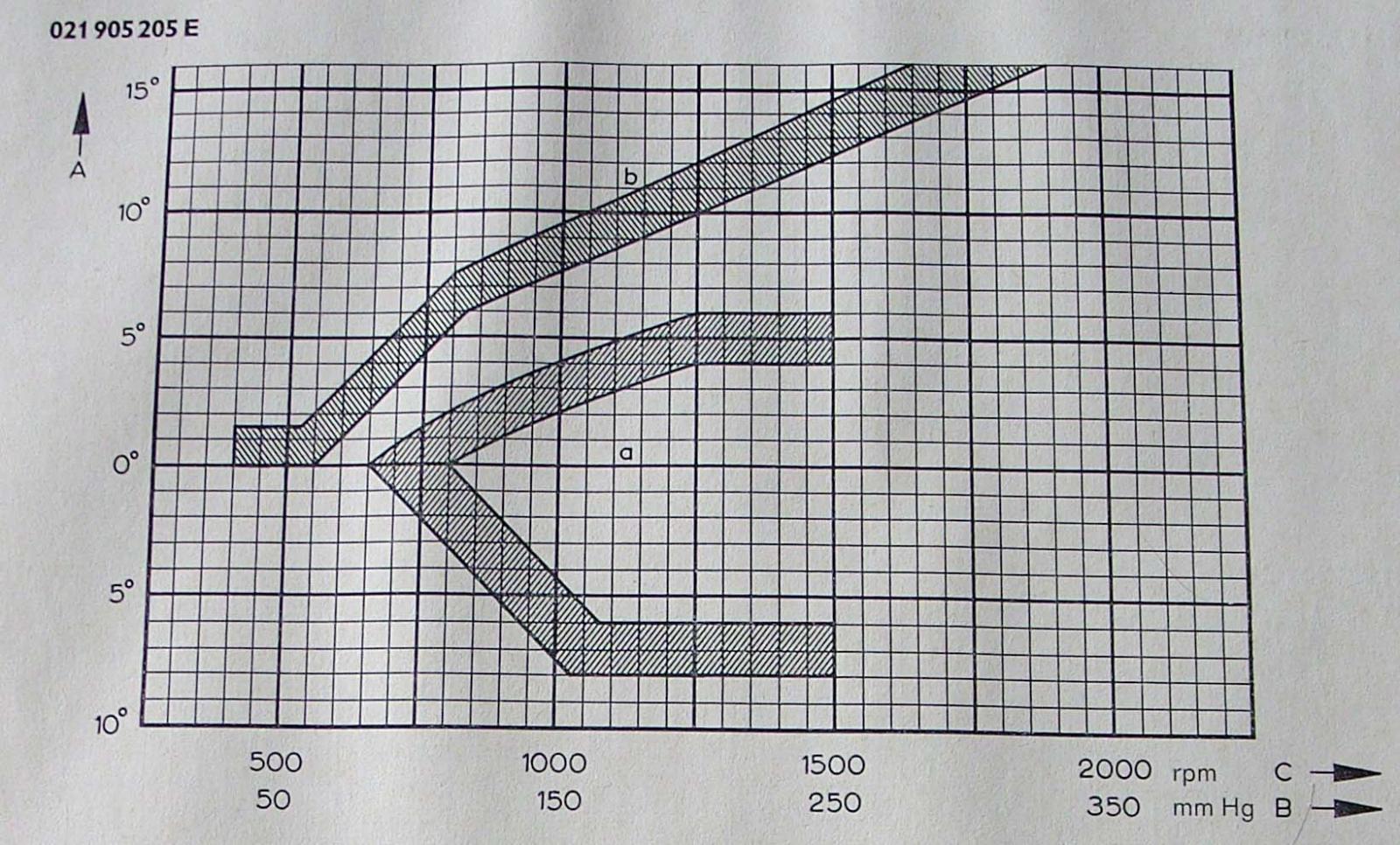der von Henning genannte 021 905 205 E verstellt maximal 16° per Fliehkraft plus 5 Grad per Unterdruck Richtung früh wenn man die Spätverstellung ignoriert und nur mit einem aufgesteckten Schlauch auf 7,5°einstellt landet man dann bei 28,5 maximalem ZZP.. Der Verteiler hat aber auch eine doppelte Dose und kann eigentlich nicht verbaut sein wenn Henning meint, dass er nur eine einfache Dose hat.