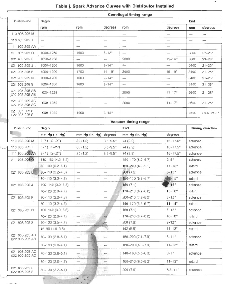 Advance/Retard Range: Vacuum: 8-12deg Adv, 11-15deg Ret; Centrifugal: 13-16deg @ 2000rpm, 23-26deg @ 3600 rpm