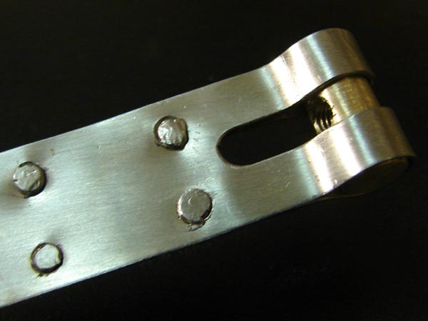 Zum Vernieten der Enden braucht man Edelstahlnieten oder ersatzweise Edelstahlschrauben (auf dem obersten Bild zu sehen, aus dem Baumarkt, meine haben 3 mm Durchmesser). Dazu die passenden Löcher ins Blech bohren, von hinten ansenken, die eingesetzte Schraube so weit abbeißen, dass sie noch 2 mm übersteht und mit dem Hämmerchen vorsichtig platt hauen (krumm hauen gilt nicht). Für das Bohren der Löcher wären Hartmetallbohrer gut, aber ein scharfer HSS auf einer Ständerbohrmaschine tut’s auch. Halt kräftig drücken, bis es qualmt. Und (Zitat Clemens): "... nicht alle Löcher gleichzeitig bohren, sondern bohren, nieten und dann erst das nächste Loch."