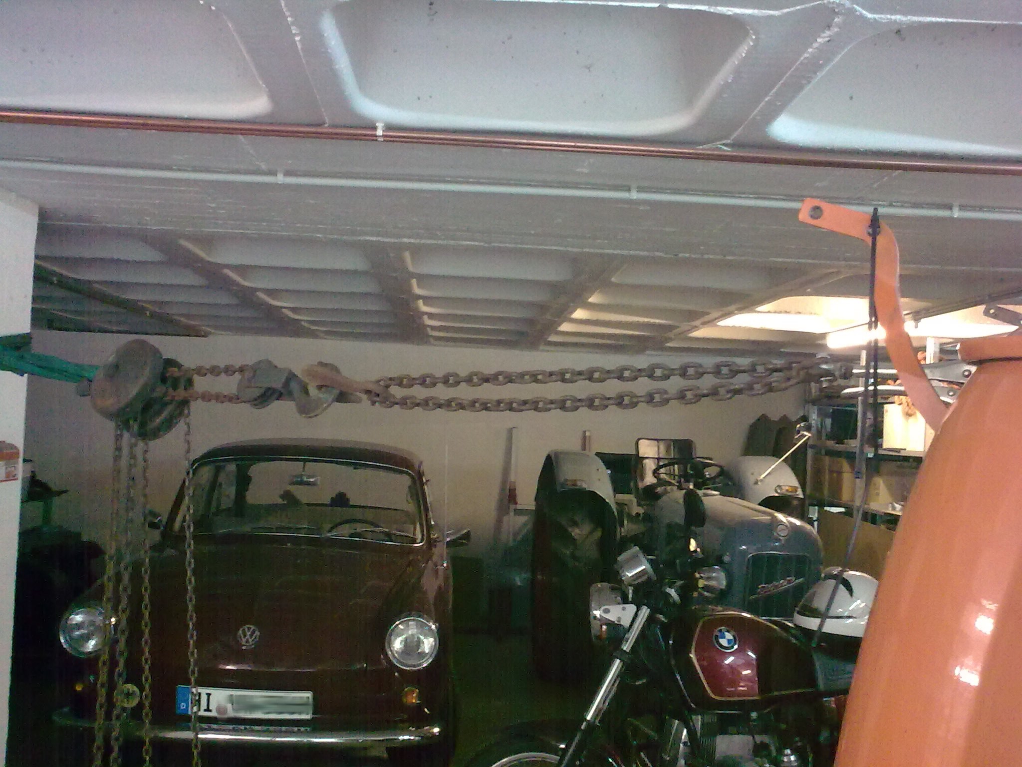 Hinter dem Auto in knapp 2 m Höhe tobt dann ein Kettenzug sich unterstützend aus, zur Sicherheit mit "Seilbremse" an der Kette, um im Fall des Abrutschens die Massen zu bremsen, was gut funktionierte.