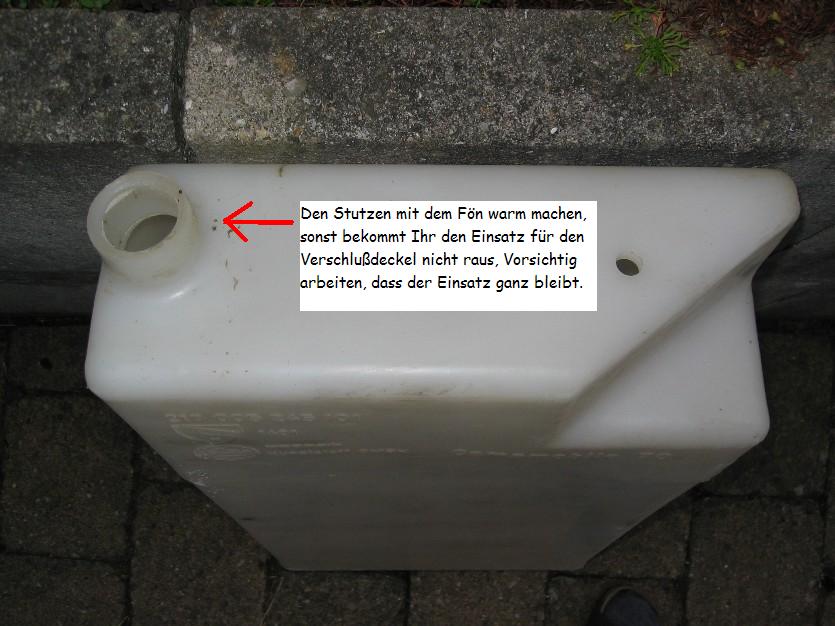 Ich habe vor Jahren den Stutzen auch nicht aus dem Behälter bekommen. Letztendlich habe ich damals den Bund am Stutzen Stück für Stück weggebrochen und den Behälter samt Füllstutzen nach unten herausgezogen. Wer es schöner haben will, kann ja den Bund sauber herunter schleifen.