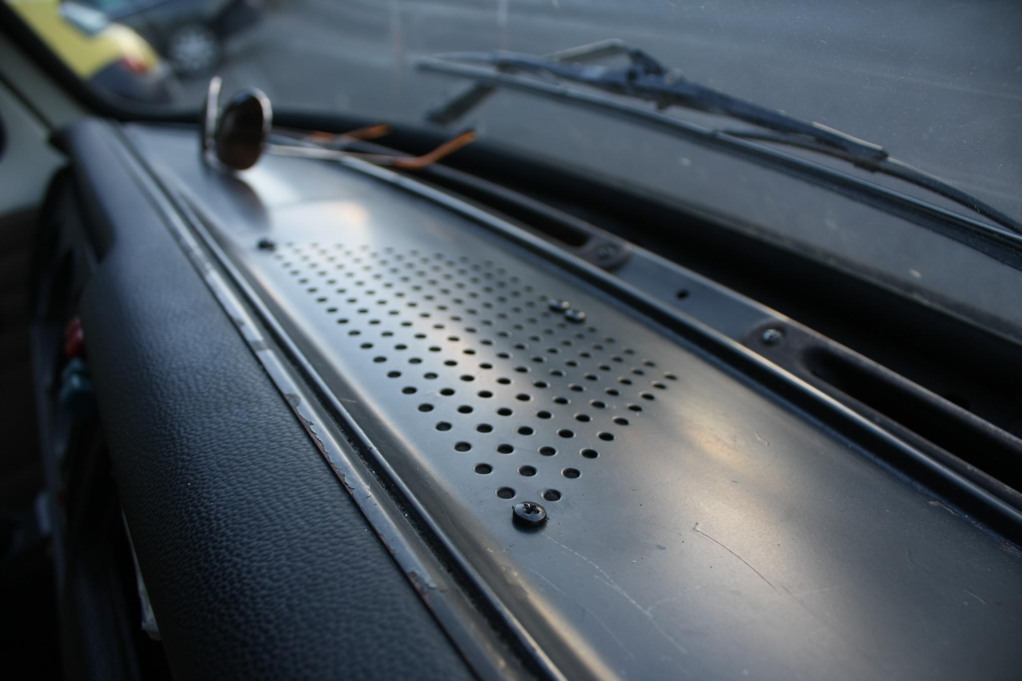 Der originale ist mittels einem Draht, der als Feder funktioniert an ein Trägerblech geklemmt das seinerseits mit zwei Beinen an der in Fahrtrichtung hinteren Seite des Armaturebrettes verklemmt ist und vorne mit einer Schraube befestigt wird. Das Schraubenloch befindet sich ca. 5-10 cm vor den Lautsprecherlöchern auf der ersten Sicke.