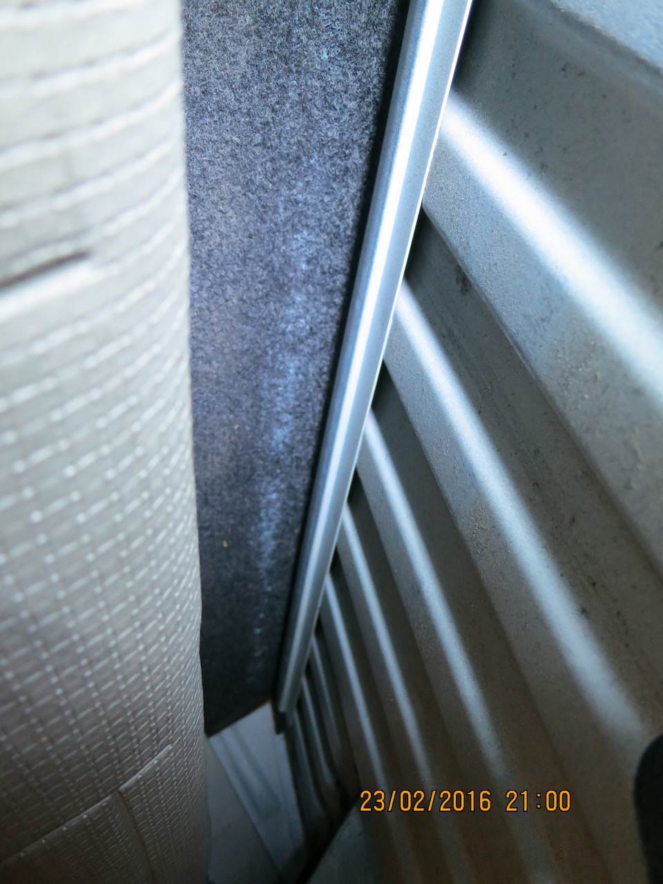 Also: bei meinem Bulli kann man die Lehne der letzten Bank nach vorn umklappen und mit einem Spannband so fixieren, dass die Rückseite der Lehne mit dem Laderaumboden eine ebene Fläche bildet. Beim Umklappen entsteht ein Spalt zwischen Lehne und Laderaumboden. Um den zu schließen, damit da nichts reinfällt, ist unten an der Lehne der rückseitige Teppich verlängert und dieser Teppich (Nadelfilz) ist in der Schiene eingeklemmt. Das Einklemmen funktioniert durch einen schmalen Pappstreifen, der am Teppichrand angenäht ist. Der Pappstreifen verklemmt sich in der Leiste, weil diese an der oberen Kante zum Landeraumboden hin eine Kante hat.