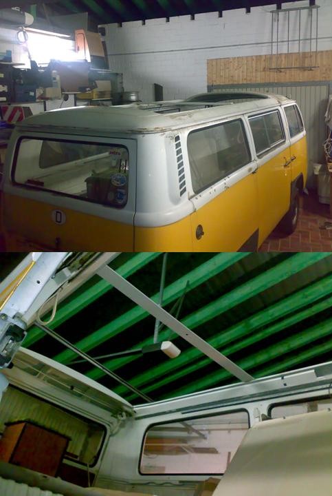 Albert thecoolvw hat grade Bilder von einem Bus gepostet, bei dem die Dachhaut ersetzt wird.