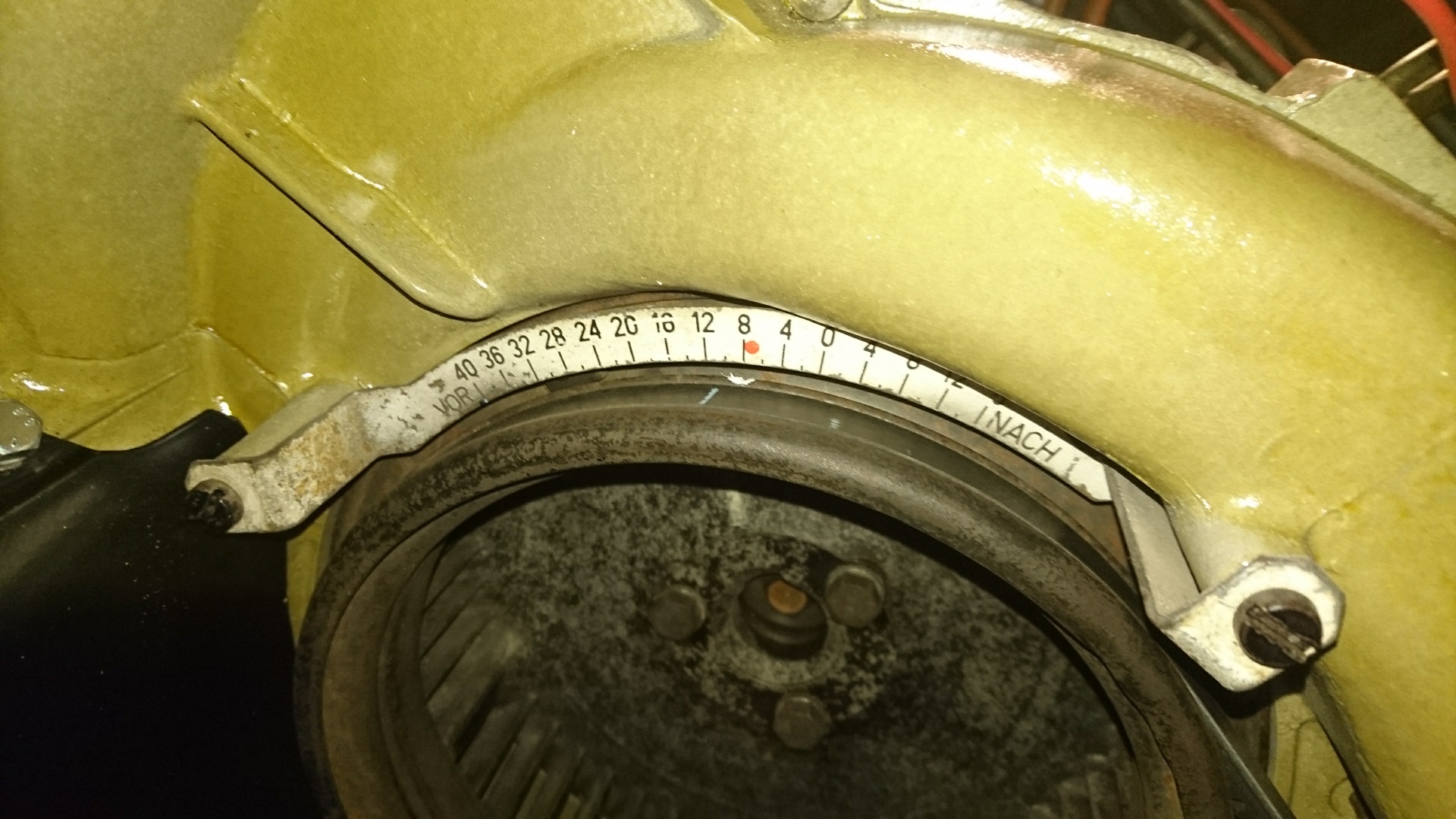 Die Markierung liegt innen an der Riemenscheibe und war bei mir nur mit Mühe zu erkennen.