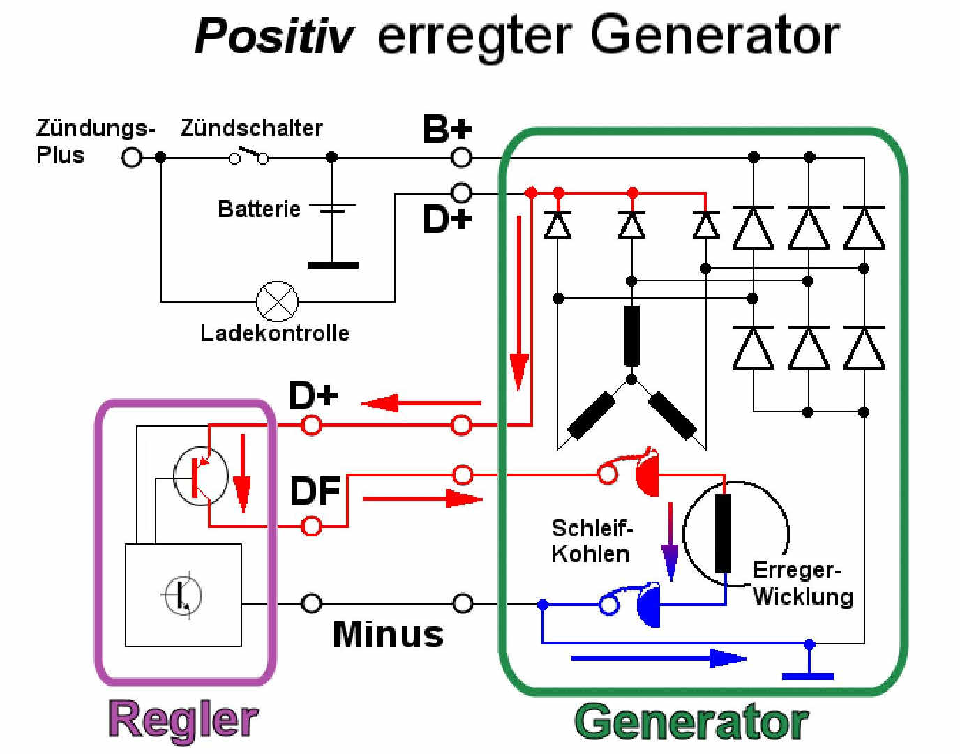 Die Erregerwicklung (im Rotor angesiedelt) liegt auf der einen Seite an Masse, halt D-, der andere Anschluss DF liegt auf (dem geregelten) + Potential. Wenn D+ höher wird als die angesetzte Regler-Spannung (im Mittel 14,2, als Toleranz 13,8 - 14,4 V) so wird diese Spannung an DF reduziert.
