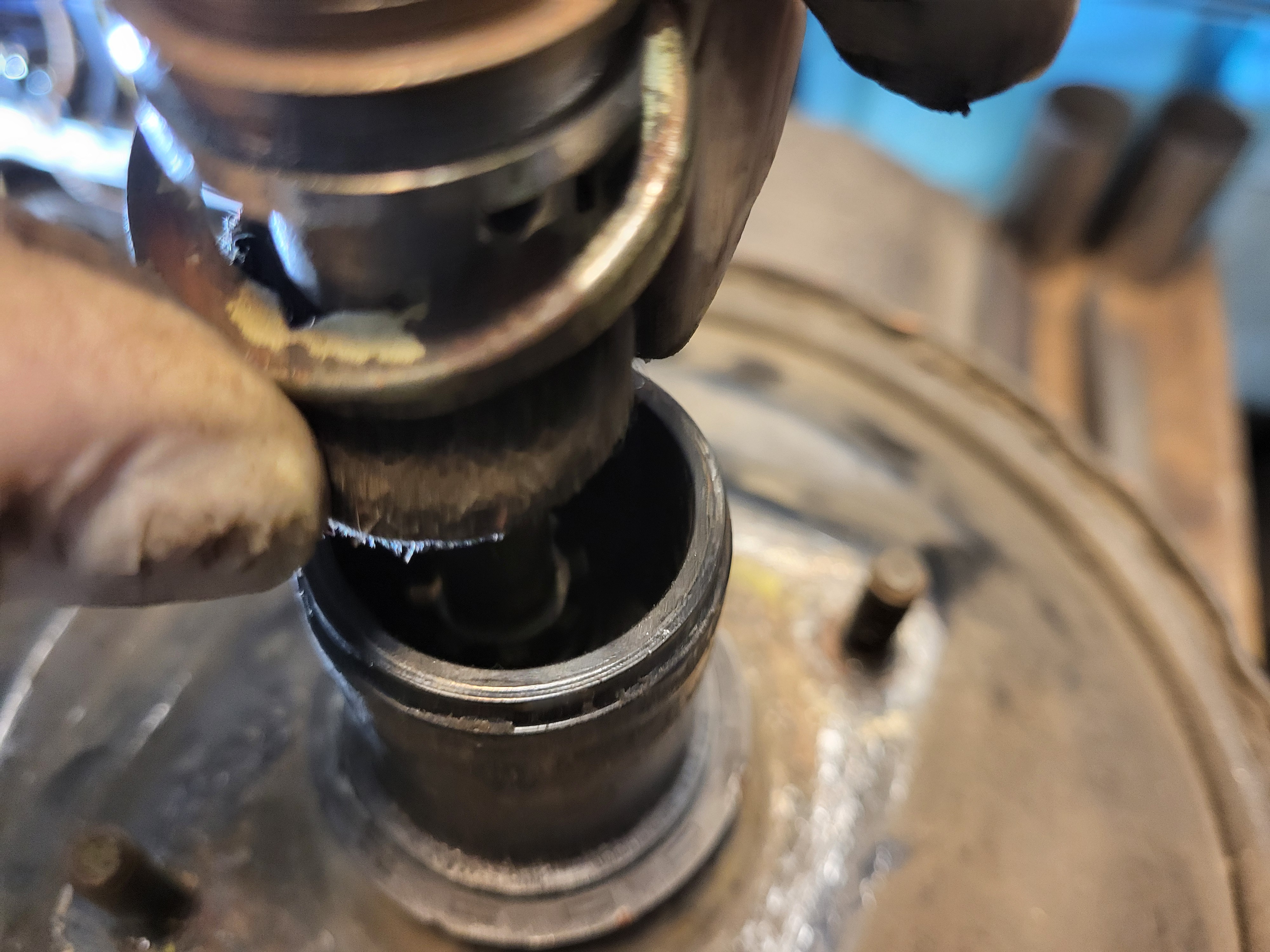 Damit kann ich mir das eigentliche Problem zwar auch noch nicht erklären, aber ich habe das alles so gut es ging gereinigt. Ersatz, so es ihn denn gäbe oder ich ihn anfertigen würde, wüsste ich nicht zu montieren da trotz Entfernung des Splintes die aufgepresste Buchse partout nicht ab ging.