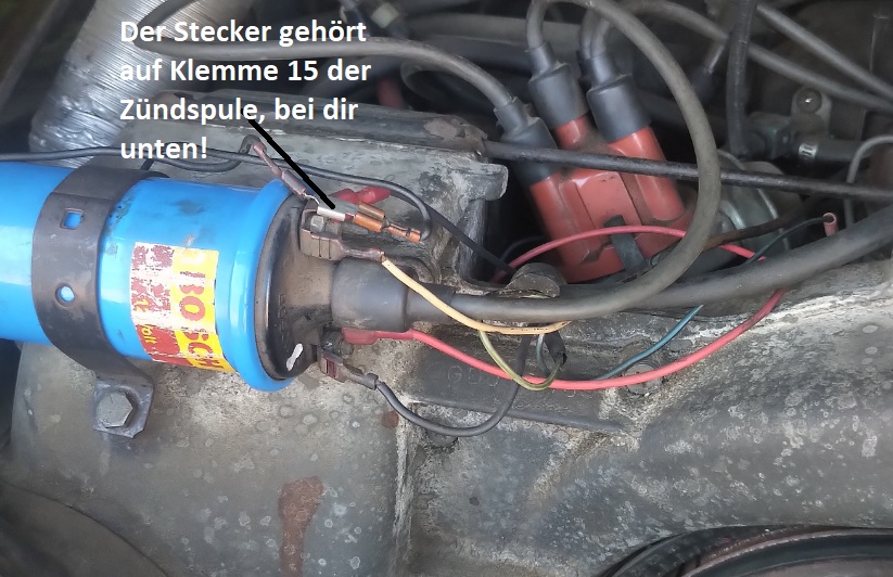 Da muss auf Klemme 15 der Zündspule ein schwarzes Kabel stecken, das Richtung Sicherung vom Rückfahrscheinwerfer geht.