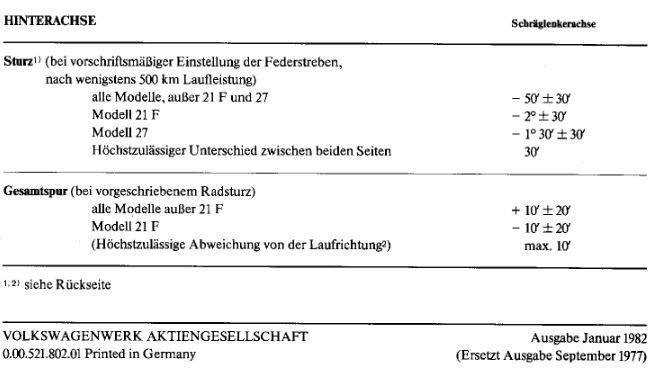 Meine persönliche Überzeugung ist, dass bei Verwendung von breiteren als den Originalreifen die Toleranzen bei den Knappmannangaben enger gefasst sein müssten. Erfahrungswerte wären da Vonnöten. Ich habe da noch eine Messmethode in Erinnerung, da hat man kleine (Gummi-)Plättchen auf die Reifen geklebt, um den Abnutzungsunterschied von Innen- zur Außenseite rechtzeitig zu bestimmen, um anschließend die Spurwerte anzupassen, damit man sich seine neuen Reifen nicht gleich malträtiert. In wieweit die Sturzeinstellung da gravierenden Einfluss hat, ist mir leider nicht geläufig, genau so wenig wie das mit dem andersartigen Tiefbett zusammen hängen könnte. Da müsste man einmal Sturz und Spurwerte von neueren Fahrzeugwerten sowie vergleichbaren Reifen zur Hand nehmen und vergleichen.