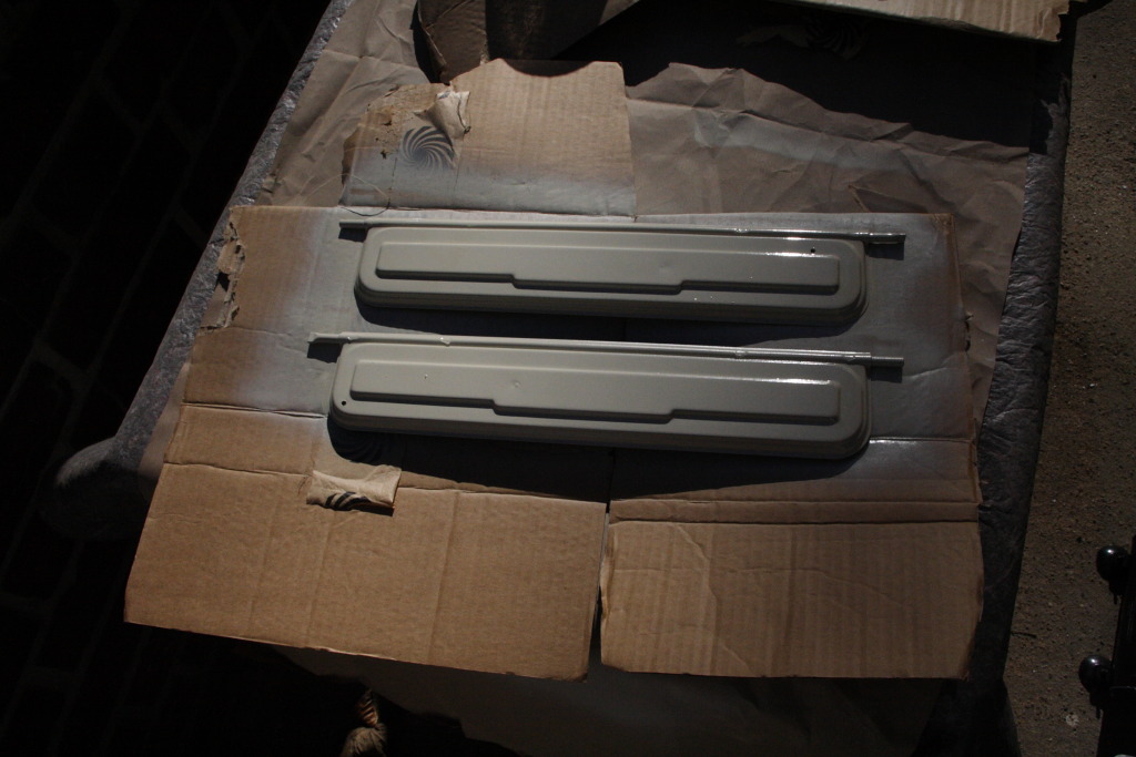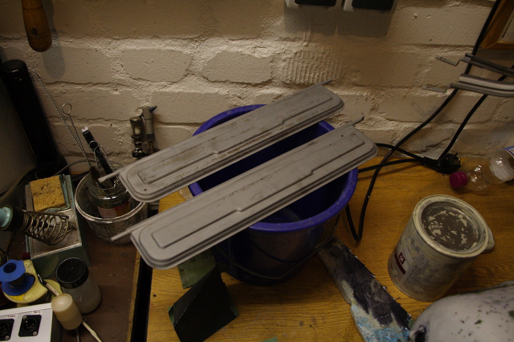 1. Klappen Sandgestrahlt. Klebstoffreste federn allerdings jeden Sand ab... 2. Klappen von jeder Seite zwei mal mit 2K Lack grundiert, jeweils 24h liegen lassen. (macht 4 Tage