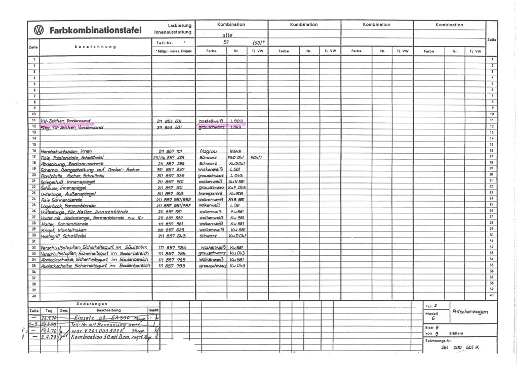 bei meiner 71er Doka ist ja nur das Oberteil des Armaturenbrettes, also die Abdeckung desselben zwischen Frontscheibe und Polsterleiste, im Originalfarbton L 043 lackiert, wie auch die Anbauteile (Lenkanlassschloss, Gehäuse Blinkerschalter, Frontplatte Ascher). Das eigentliche Armaturenbrett mit Schalttafeleinsatz ist seit dem Modelljahr 1971 mit schwarzem "Plastiküberzug" versehen.