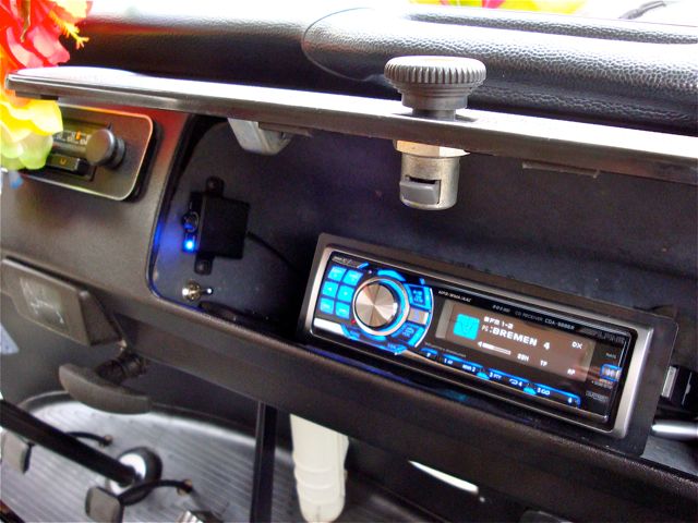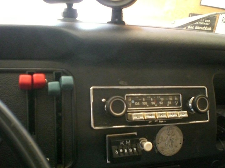 VW-Radio Emden II oder so, mit FM-Transmitter für MP3. Als Schallquellen dienen 2 Blaupunktkugeln, spurlos rückrüstbar unter dem Armaturenbrett befestigt.