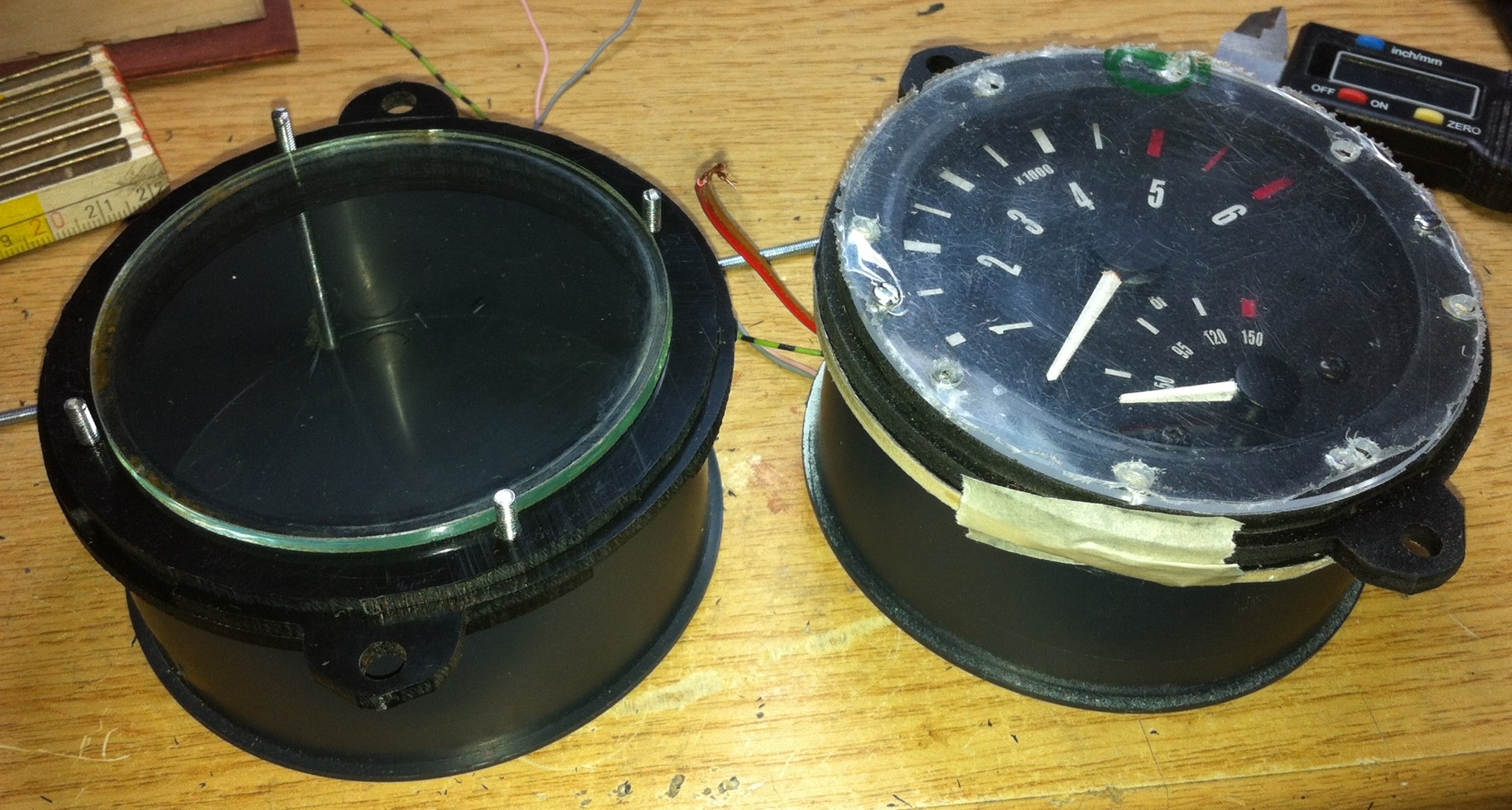 Auch für Thomas' Version mit der Uhr bräuchten da keine Löcher oder sowas rein. Einfach nur ne runde Scheibe. Die würde dann mit dem DZM verklebt (ich liebe Stabilit express) oder sogar einfach nur zwischen Instrumententräger und DZM festgeklemmt.
