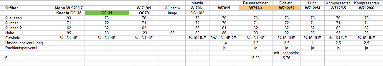 um die Platzverhältnisse an der CSP Adapterplatte beim Typ 4 Motor für den Ölkühlerabgang etwas zu entspannen besteht die Möglichkeit einen anderen Ölfilter zu nutzen, der Filter selbst ist dann aber etwas länger :