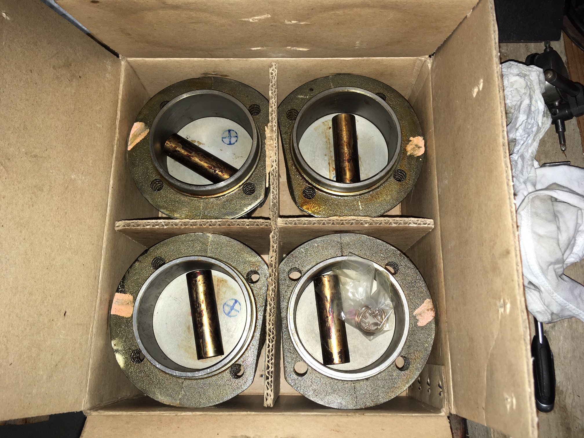 Später mit den Ausgleichsscheiben musst Du genau so darauf achten, dass sie unten am Fuß auch wiederum plan aufliegen. Ich musste die Scheiben im Durchmesser etwas anpassen, weil in meinem Fall die Zylinder am Fuß nicht scharf genug abgedreht waren.