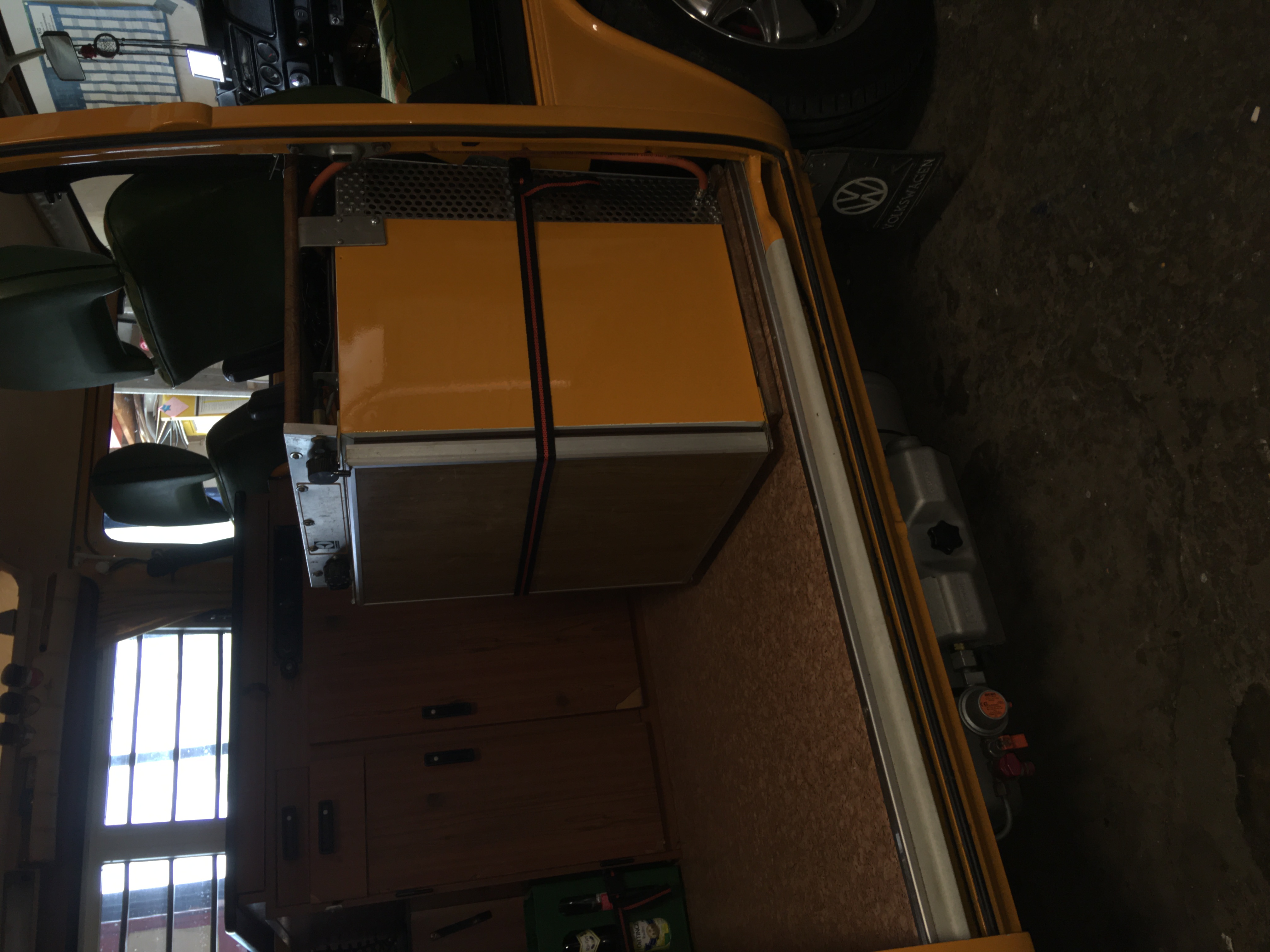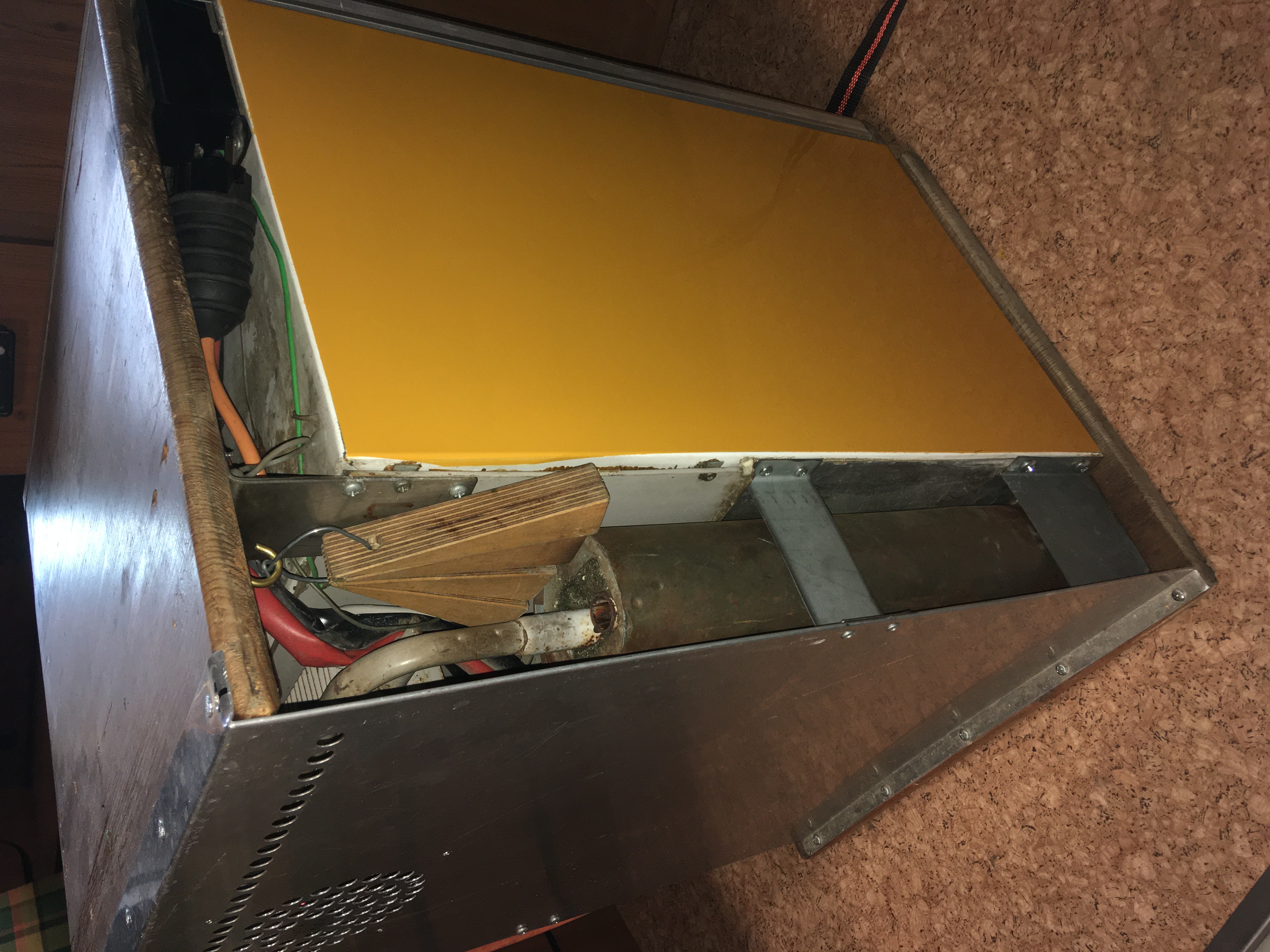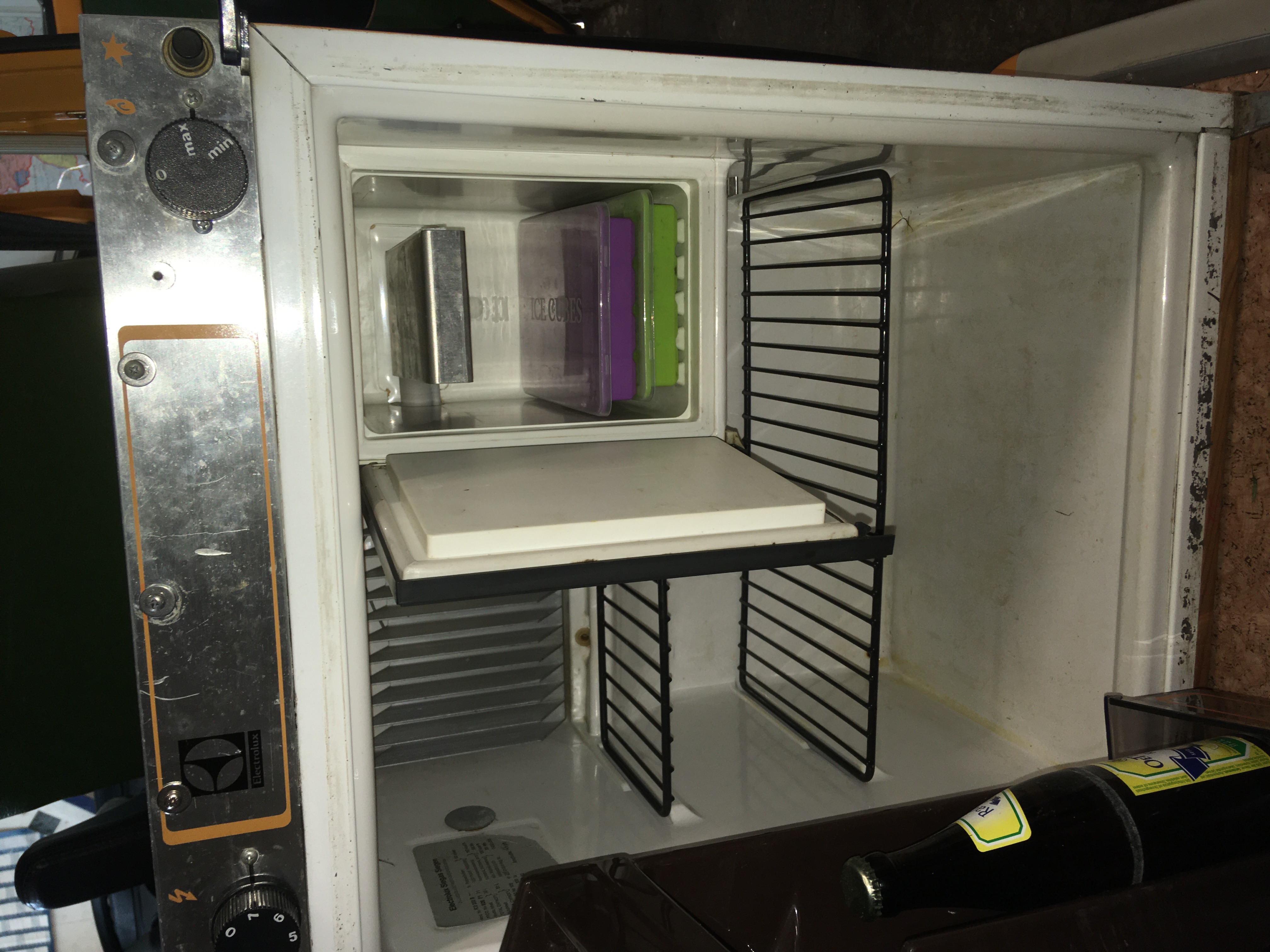 Es handelt sich um einen Kühlschrank aus einem alten Wohnwagen der ausgeschlachtet wurde, ca. 50 Jahre alt, das war noch Qualität, und er läuft und läuft und läuft